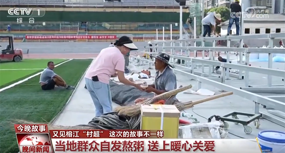 在“村超”球场铺设草坪的这段时间里,榕江天气炎热,当地群众自发给援建团队送西瓜、煮玉米。还有的居民特意熬制了百合红枣小米绿豆粥,送到了“村超”球场。