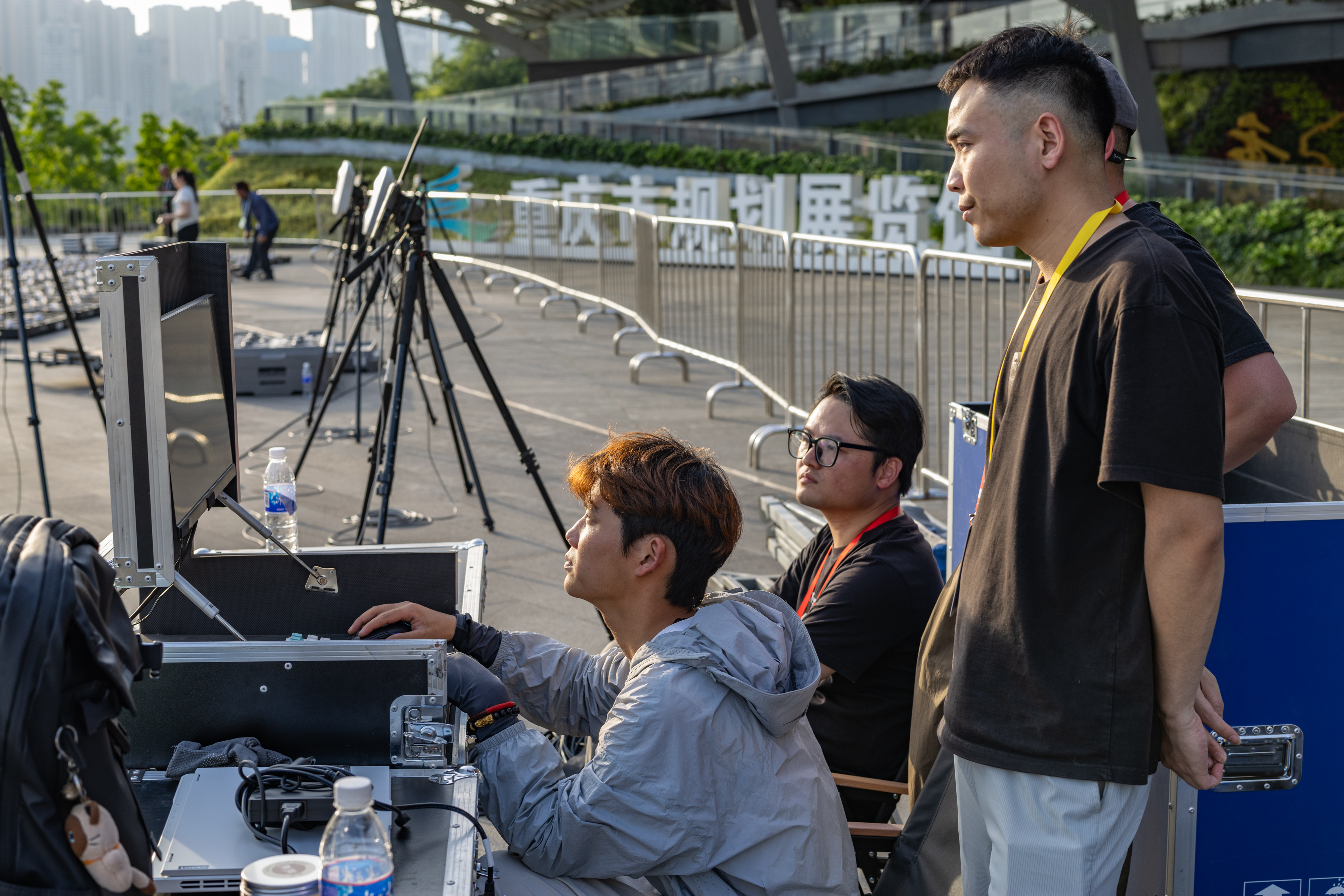 他会和同事一起前往表演场地