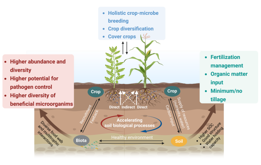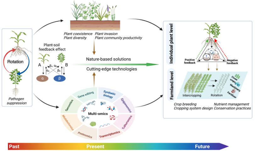 具体来讲,团队提出了促进“植物-土壤正反馈”的绿色方案:靶向开展作物遗传育种,从野生植物中挖掘新基因和调控代谢路径,提高有益微生物的正反馈作用和作物对病虫害的抗性;通过调控作物生长响应,改善土壤微生物的栖息环境等,实现作物和微生物的互作增效;改善土壤结构,提高生物多样性,有助于增强土壤生物活性,抑制病虫害,提升土壤健康与农田可持续性。