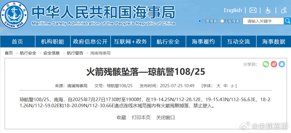 航行警告!南海海域有火箭残骸掉落