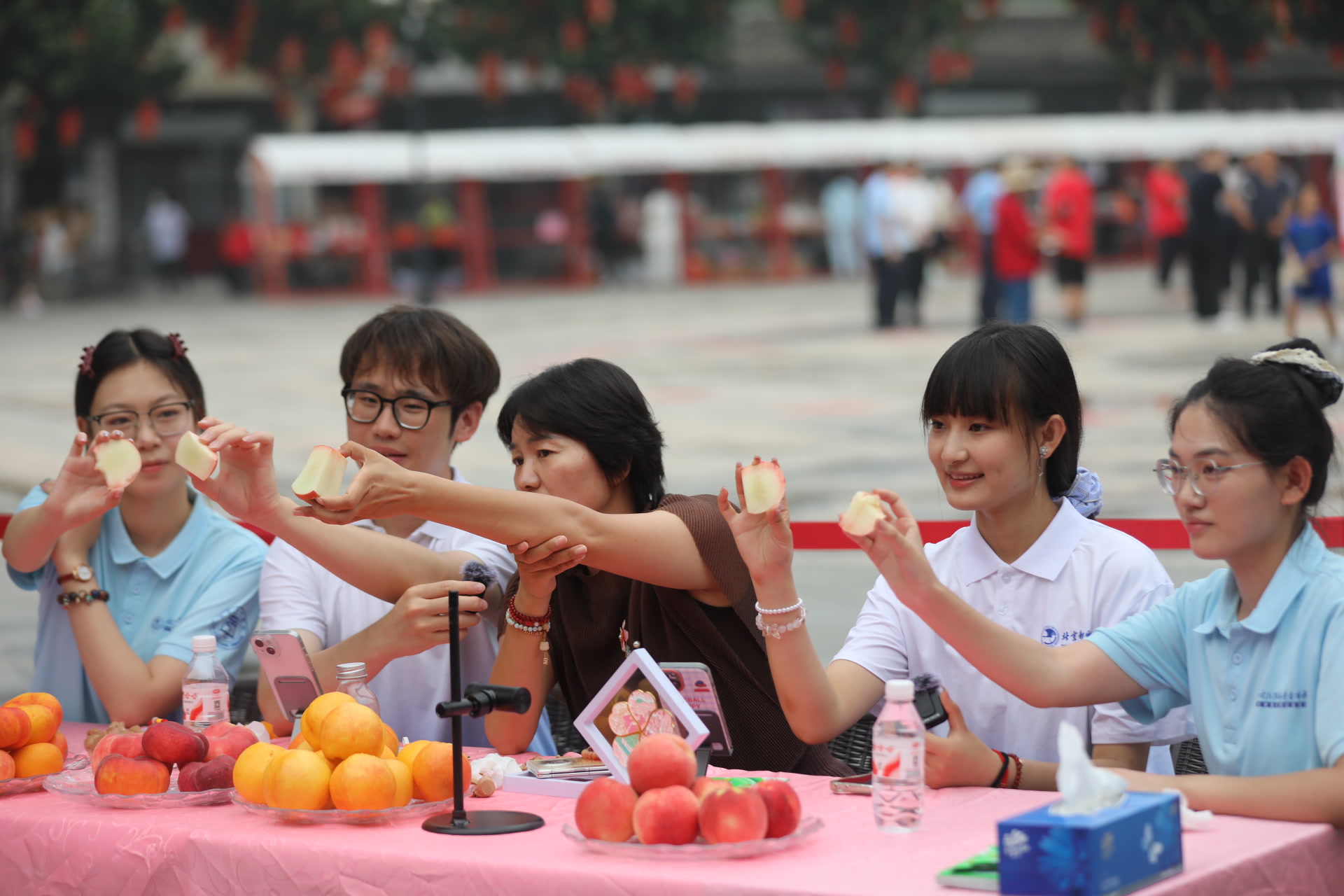盛夏的平谷桃香馥郁,蜿蜒的村路旁,数不清的快递车从山里开出来,里头满载的多半是大桃。上午8时,丫髻山下的太极广场摆上了长桌,一堆堆桃子摆成了小山,圆的扁的、红的黄的,种类相当多。