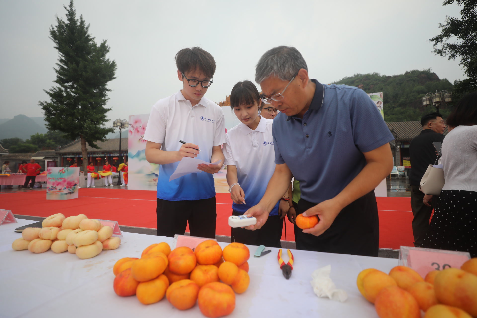 平谷是首都最大的果品产区。7月27日上午,平谷大桃的主产镇刘家店镇举办了一场“蟠桃盛会”。十里八村的果农捧着自家的大桃来打擂,甜度最高的达到了27.5度。