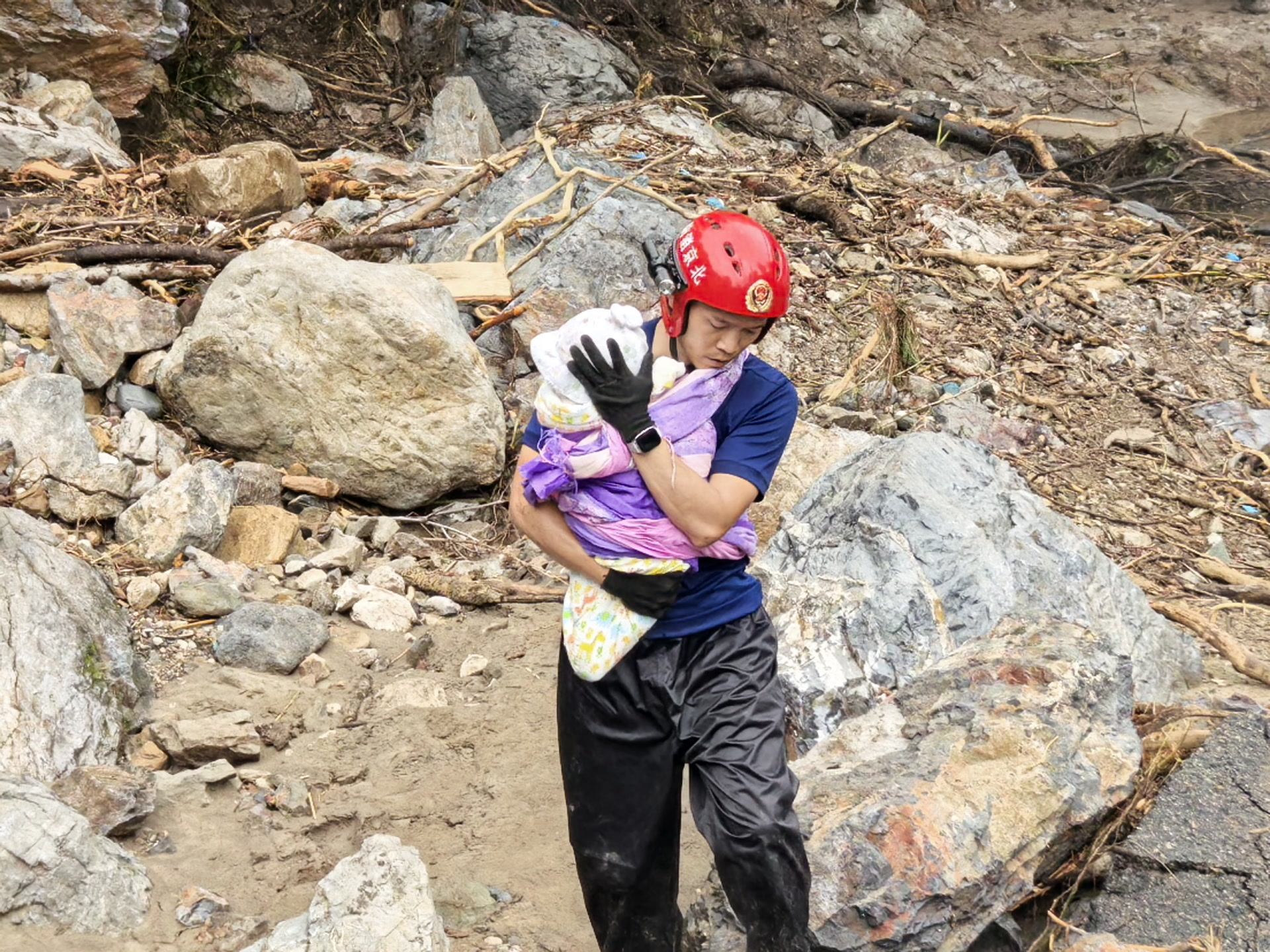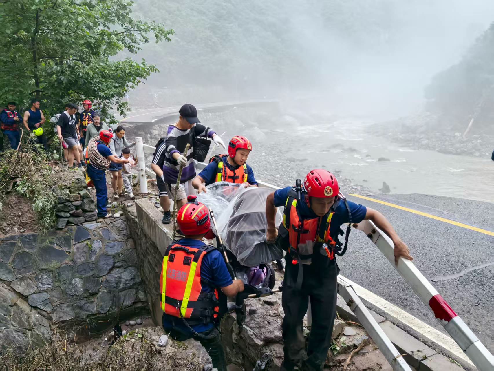 在一处被洪水冲出的绝壁上,消防救援人员快速架设起救援绳索系统,在队员们的保护下,有自主行动能力的被困群众,紧抓绳索,小心沿损毁道路的边缘艰难通过;对于行动不便的老人、儿童和伤者,队员们毫不犹豫地俯下身,将他们一个个背负过险段。