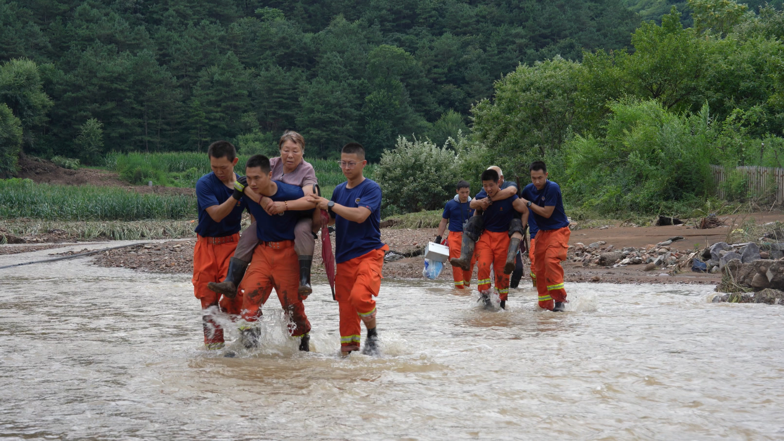 27日下午至28日,接上级命令,支队增援队派出30名队员前往怀柔区西湾子村营救被困群众,队员分乘5艘冲锋舟在当地向导的引领下,翻山涉水、披荆开路、搭桥过河……共计营救被困群众82人,疏散转运群众321人,运送应急物资3吨。