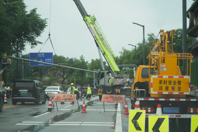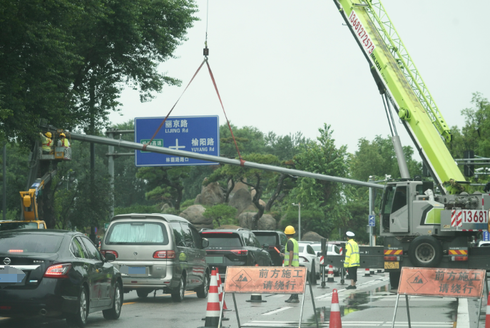 直击|顺义区林荫路路口,被大雨损坏的道路设施正在抢修