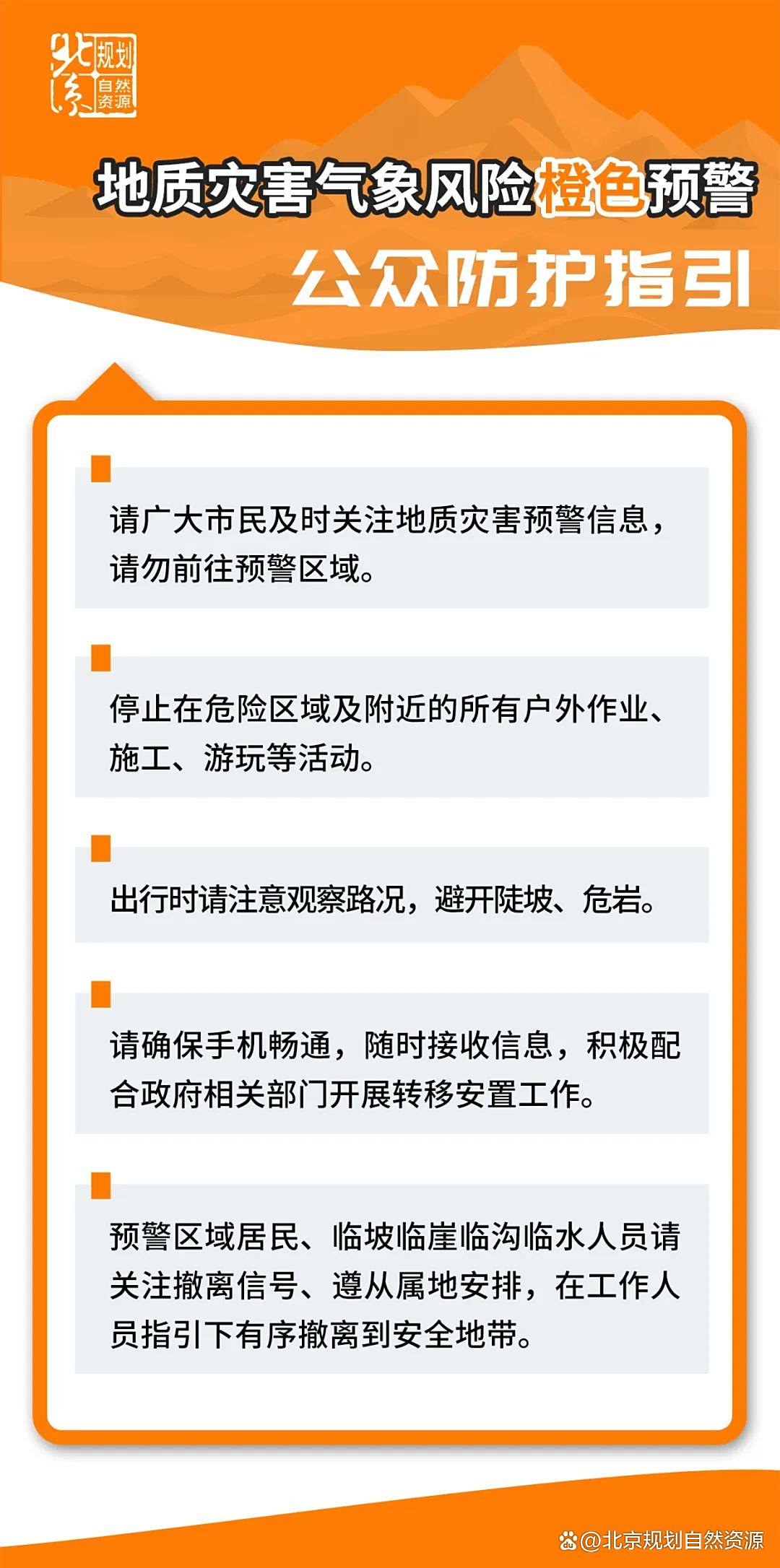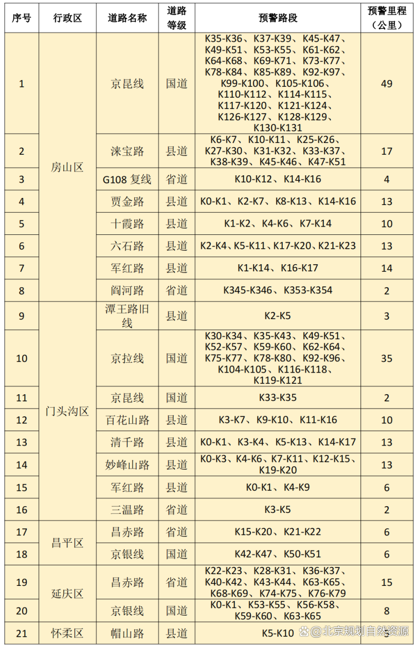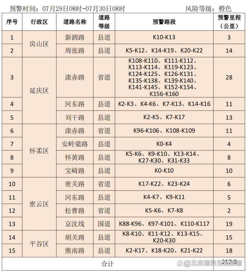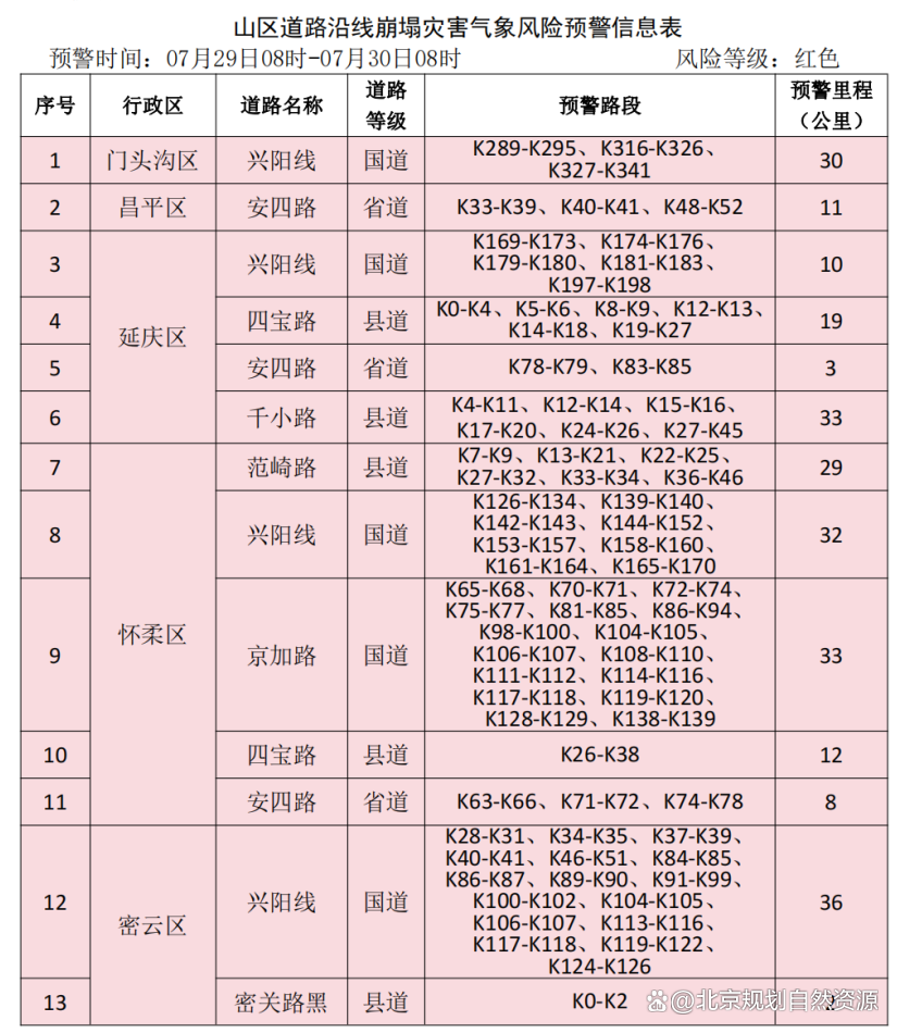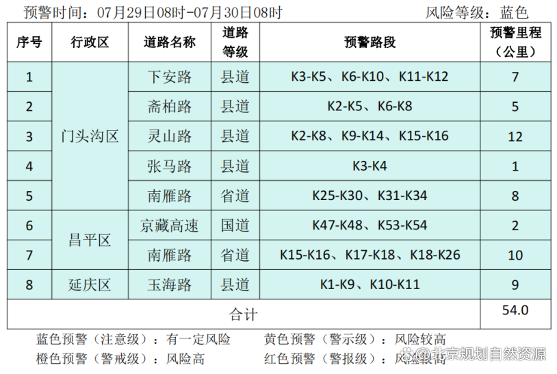 7月29日8时-7月30日8时房山区、门头沟区、昌平区、延庆区、怀柔区、密云区、平谷区山区道路沿线局部路段山体斜坡发生崩塌灾害的风险很高,请注意防范。
