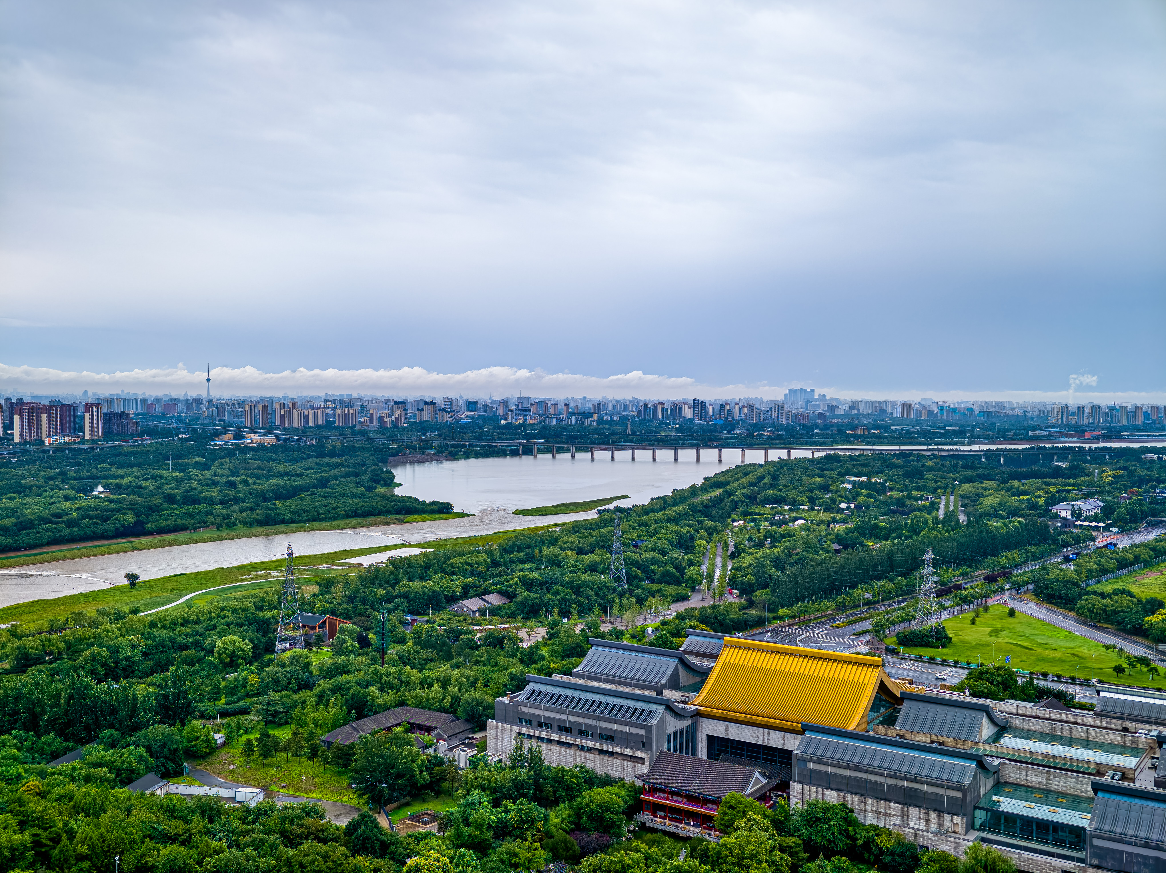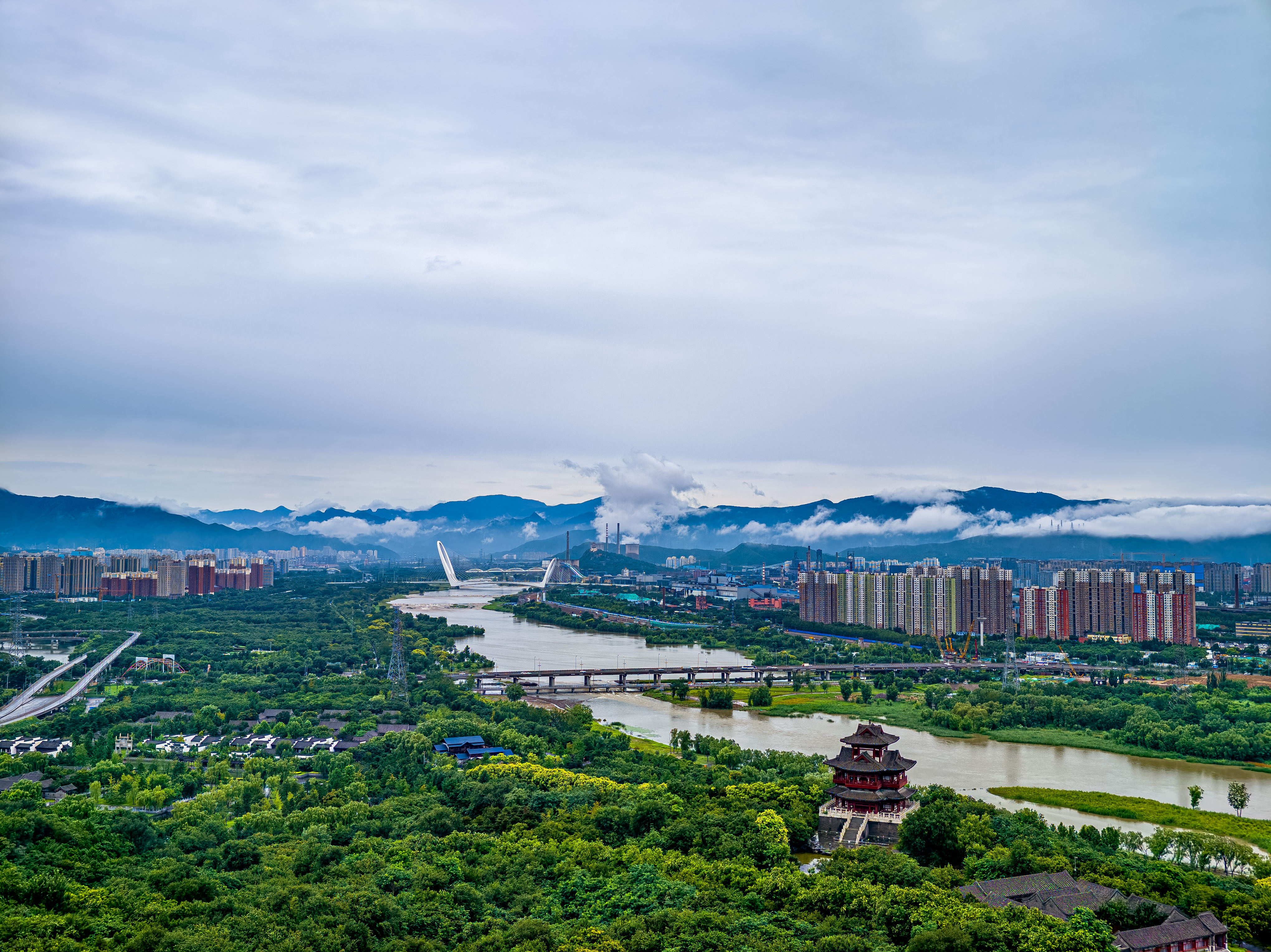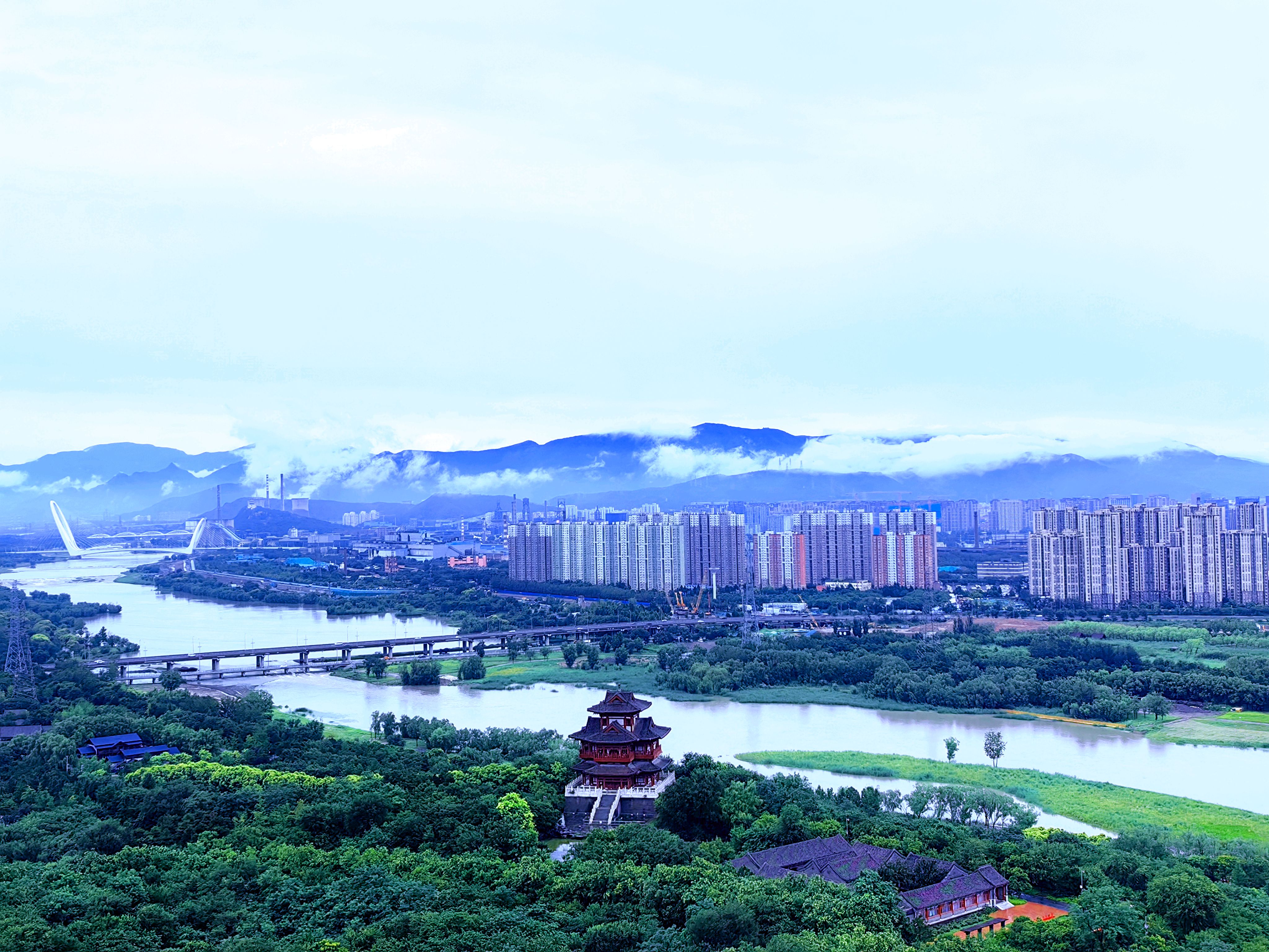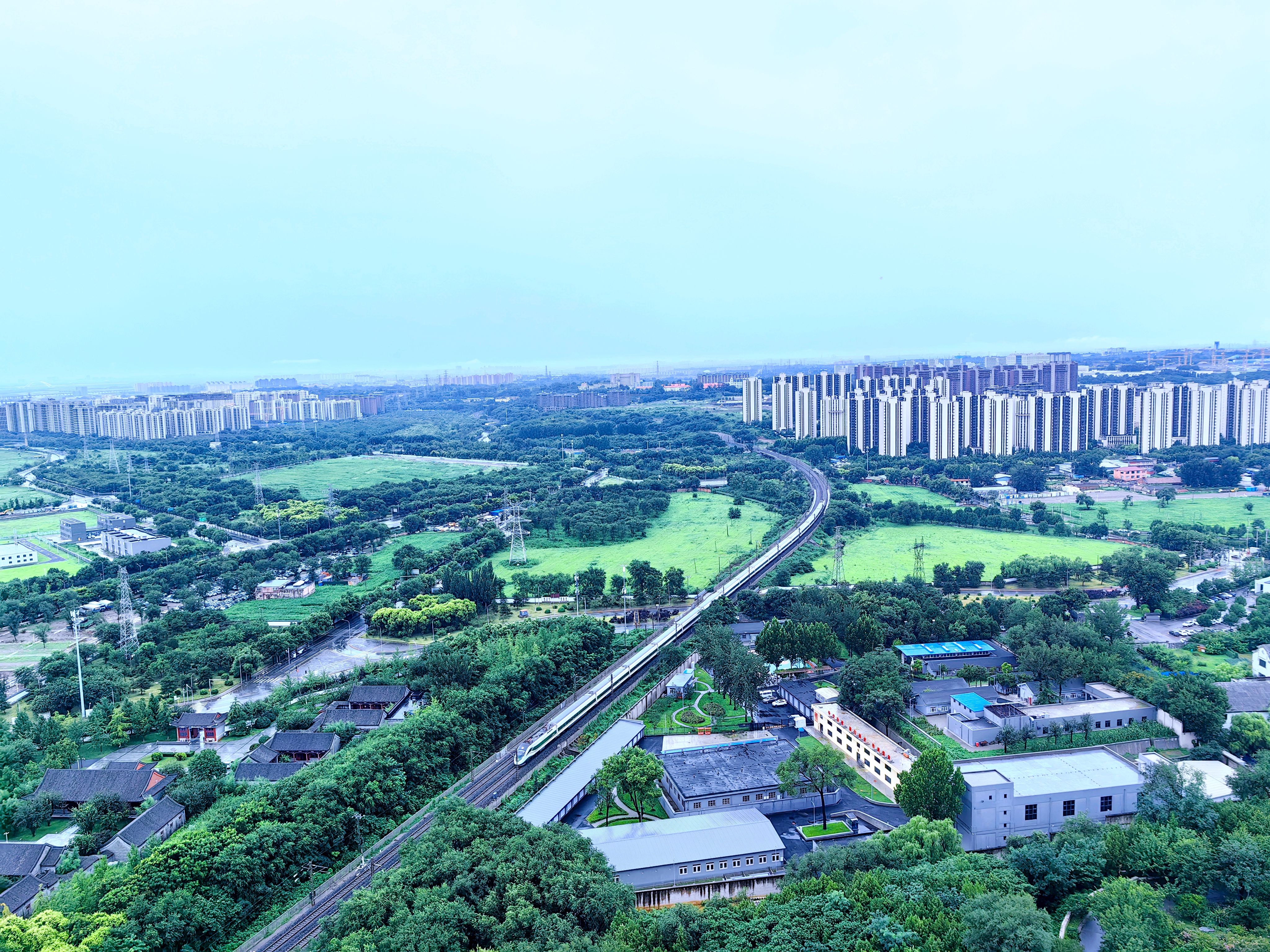 雨水初歇,天地如洗。立于永定塔上,云海翻涌如时代奔流,丰台全貌破雾而出。丽泽楼宇伸入云端,科技园区轮廓清晰,永定河脉动如常,列车与白鹭共绘流动长卷——这城市肌理在雨水的涤荡后愈发清晰。