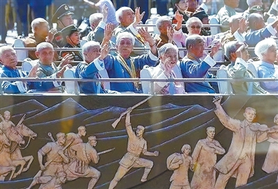 2015年9月3日,纪念中国人民抗日战争暨世界反法西斯战争胜利70周年阅兵仪式上,抗战老兵方队中的翟维俊(前排左四)。图为受访者提供