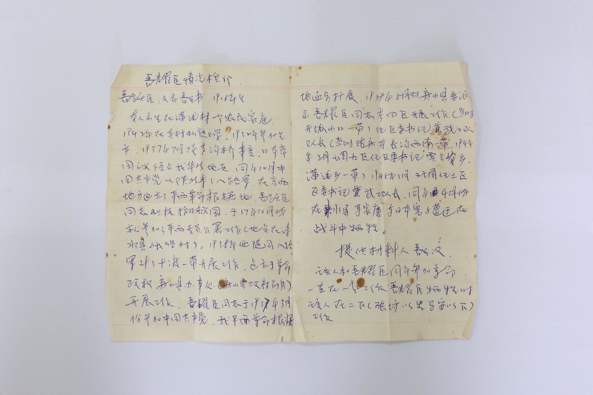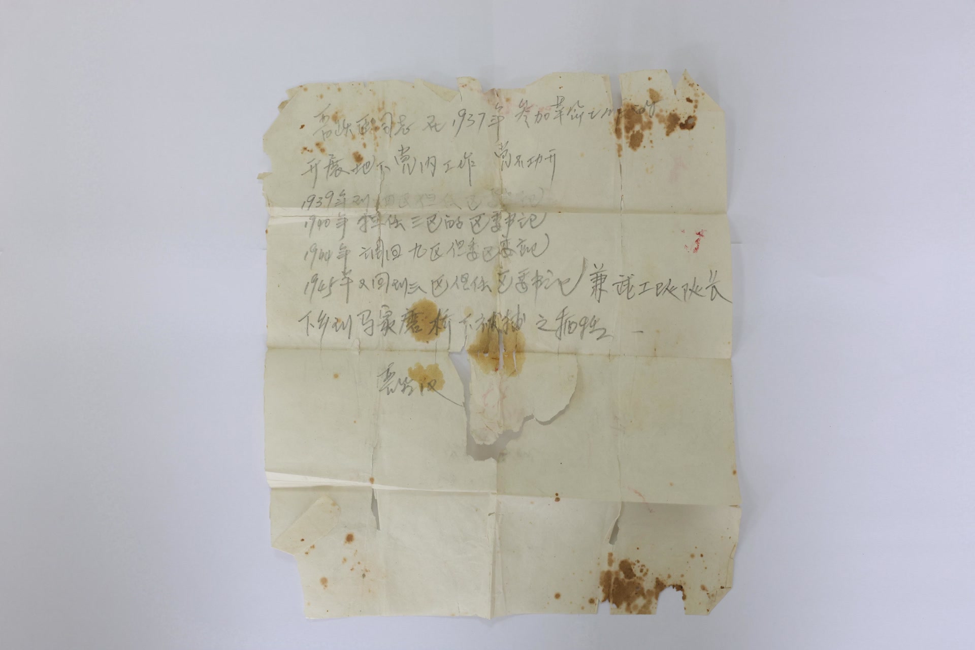 当王秀芳老人珍藏的牛皮信封被缓缓打开时,时间仿佛凝固了。泛黄的纸张上,《晋耀臣烈士传》、革命经历证明、王秀芳的党员登记表等文件一一呈现。其中,1987年由宋成明整理的《晋耀臣烈士传》详细记录了晋耀臣从投身革命到壮烈牺牲的全过程;一份证明材料清晰记载了晋耀臣 1937年参加革命、1939年入党的关键节点;王秀芳的简历则见证了一位农村妇女成长为抗日骨干的历程。