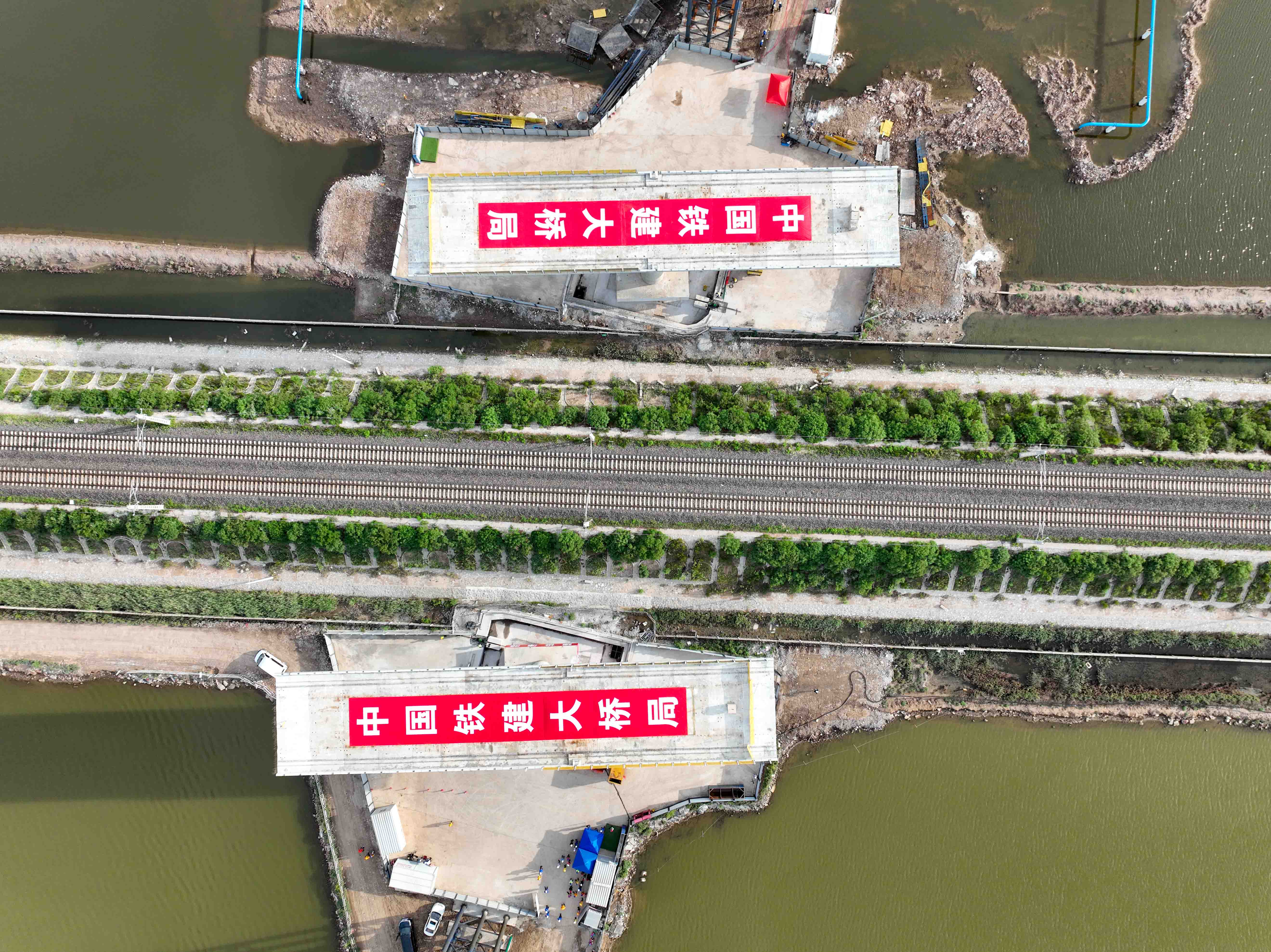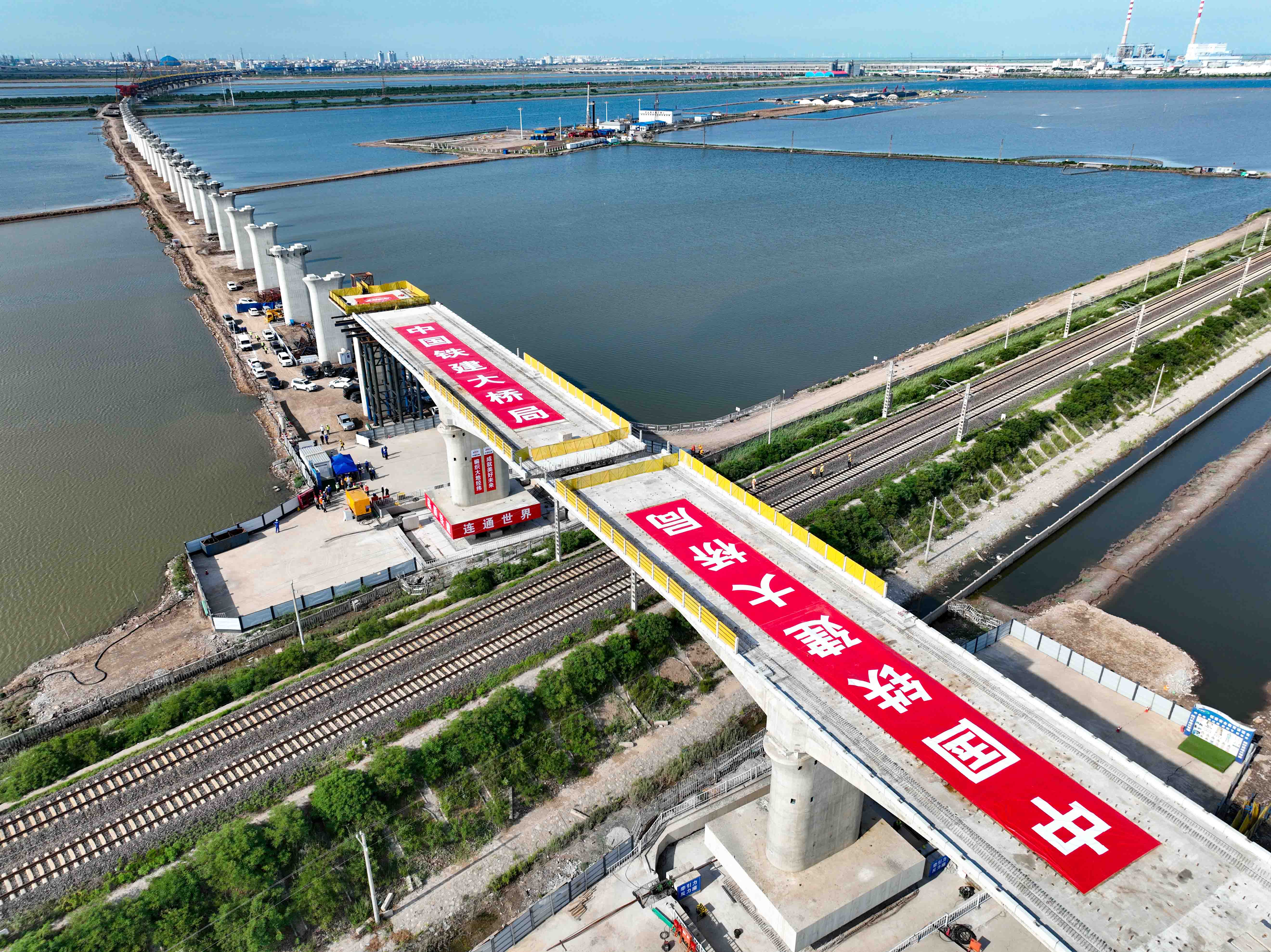 7月31日,在中国铁建大桥局津潍高铁天津段施工现场,重7700吨的两座T构桥梁,历时120分钟同步旋转79度抵达设计位置,津潍高铁上跨南港铁路转体桥实现精准合龙,至此津潍高铁天津段唯一转体桥成功就位。