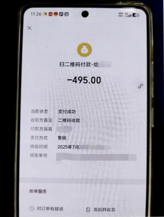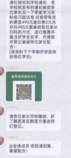 没承想,骗子也混入群内,冒充“群主”老师发送交费通知:“麻烦各位家长交一下季度学习资料、练习题试卷等资料费490元、复印费5元,合并共495元整。各位家长扫码进行缴费并备注好学生名字,方便核对登记,谢谢各位家长配合…”紧接着还发布了支付二维码,并@群内成员,要求尽快交费。