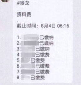 由于是学校建立的新生家长群,“老师”通知交费的数额也不多,还“贴心”地让家长交费时备注好学生姓名,交费后截图接龙便于登记,家长们便信以为真。短短40多分钟内,共有9名家长扫码交费,共计4000余元。另一名“老师”还将交费的家长拉进小群。