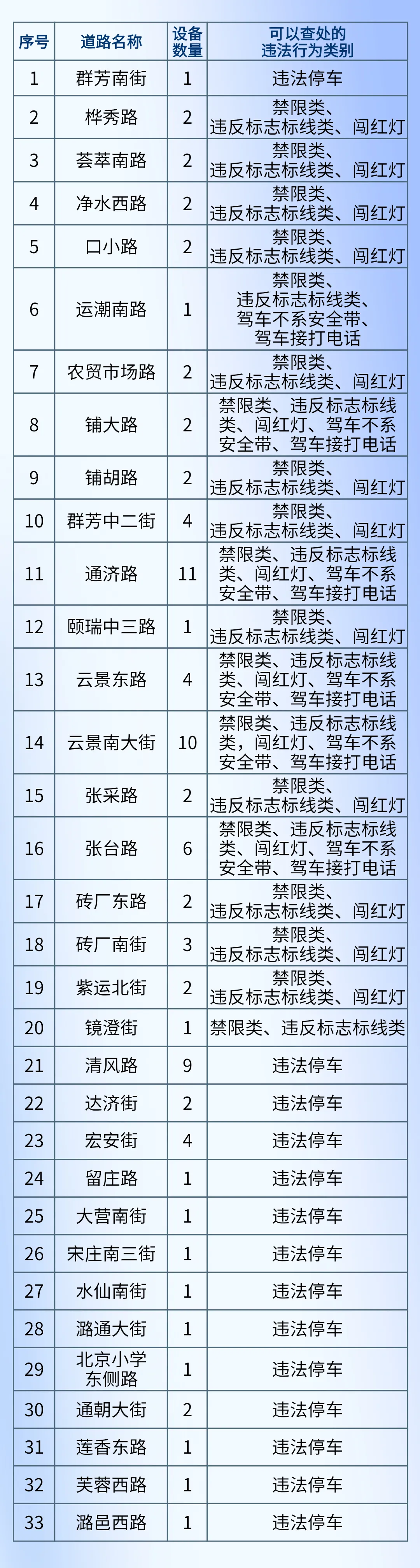 其中,通州区33条道路新增88个探头。涉及群芳南街、运潮南路、张采路、紫运北街、潞通大街、芙蓉西路等一批路段。