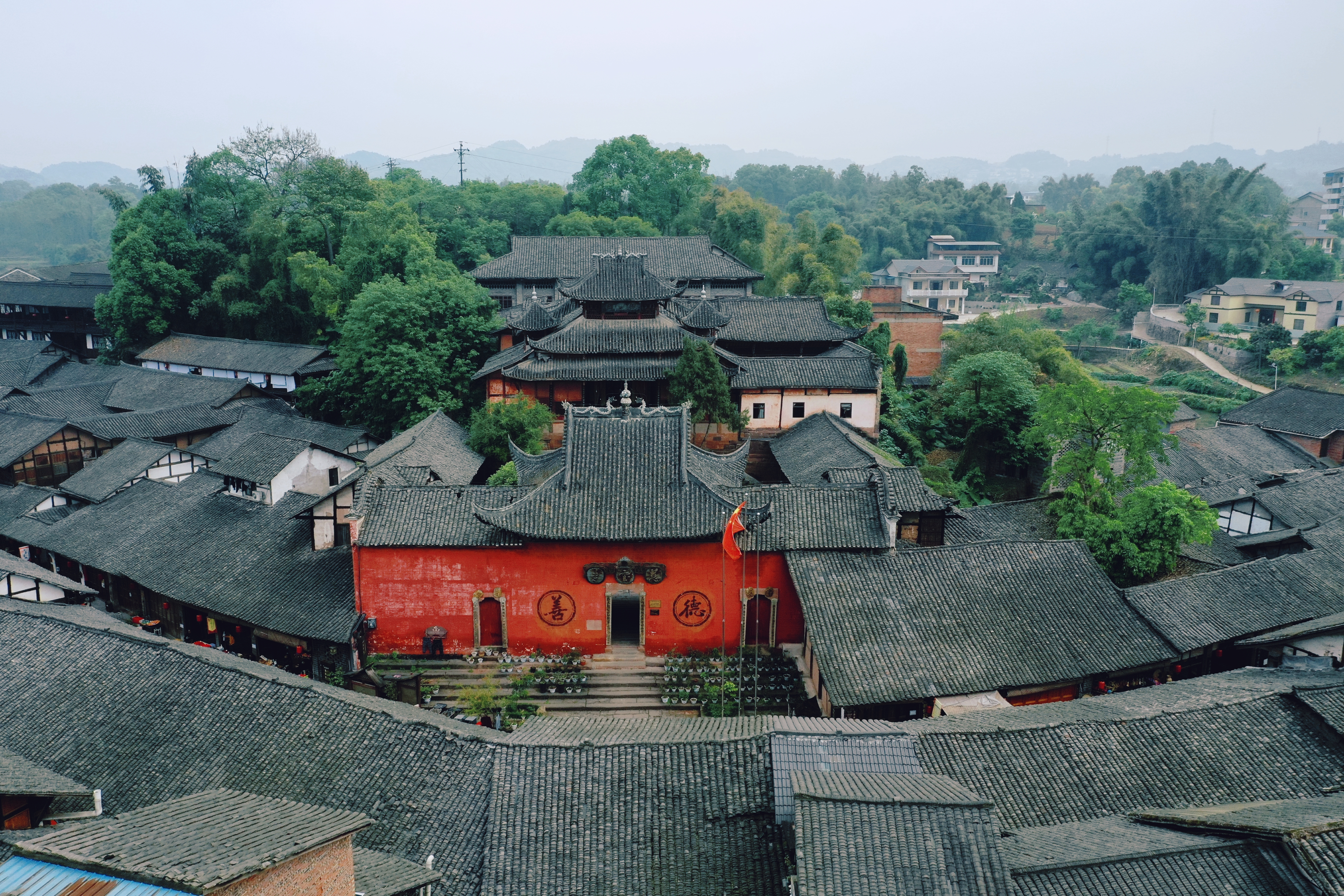 在石牌坊前,我将无人机升起,在古镇的上空寻找着最佳视角。透过旋转的镜头,蓦然发现,云烟背后的古镇,依然在日出日落中过着属于自己的祥和日子。