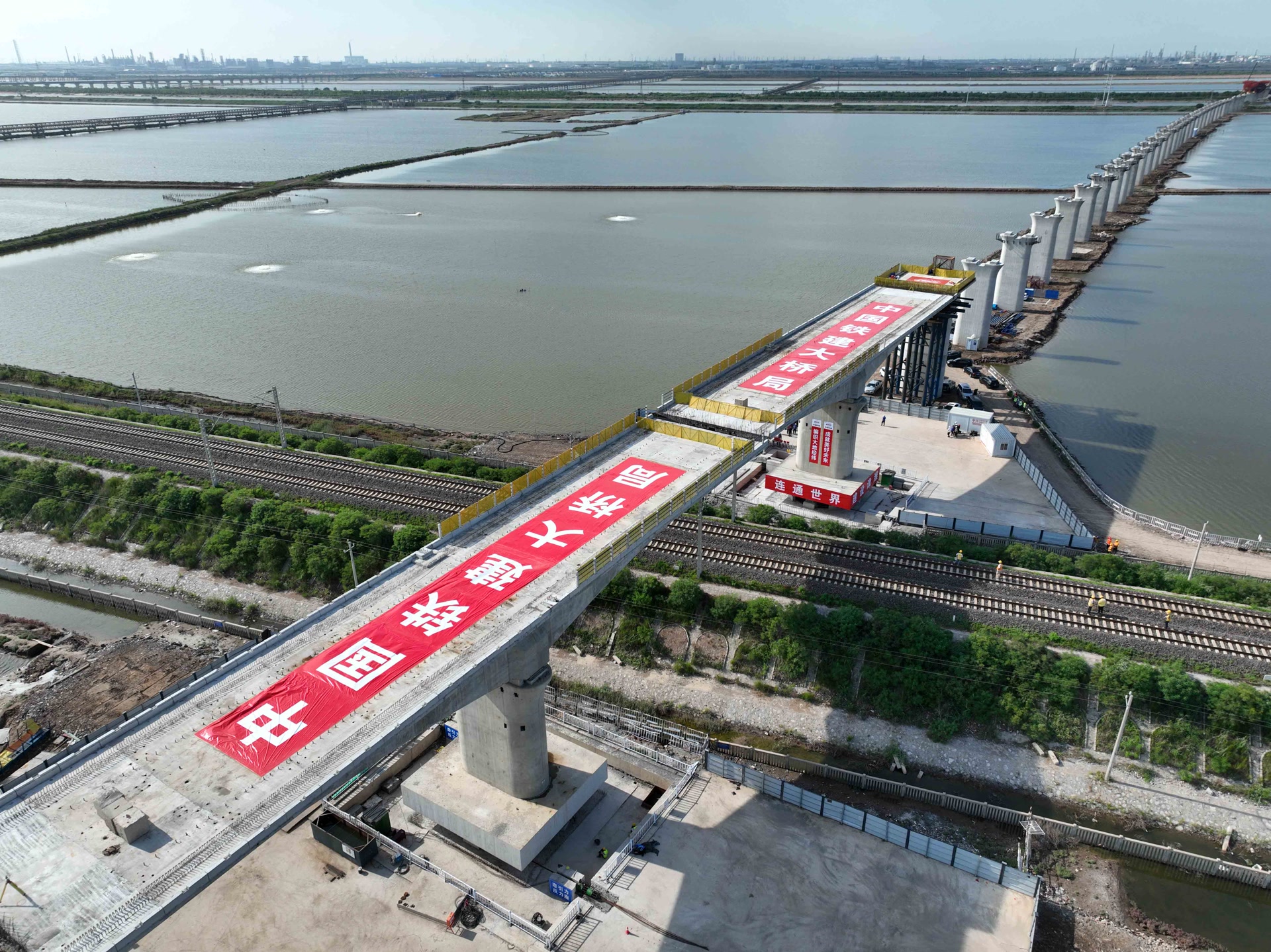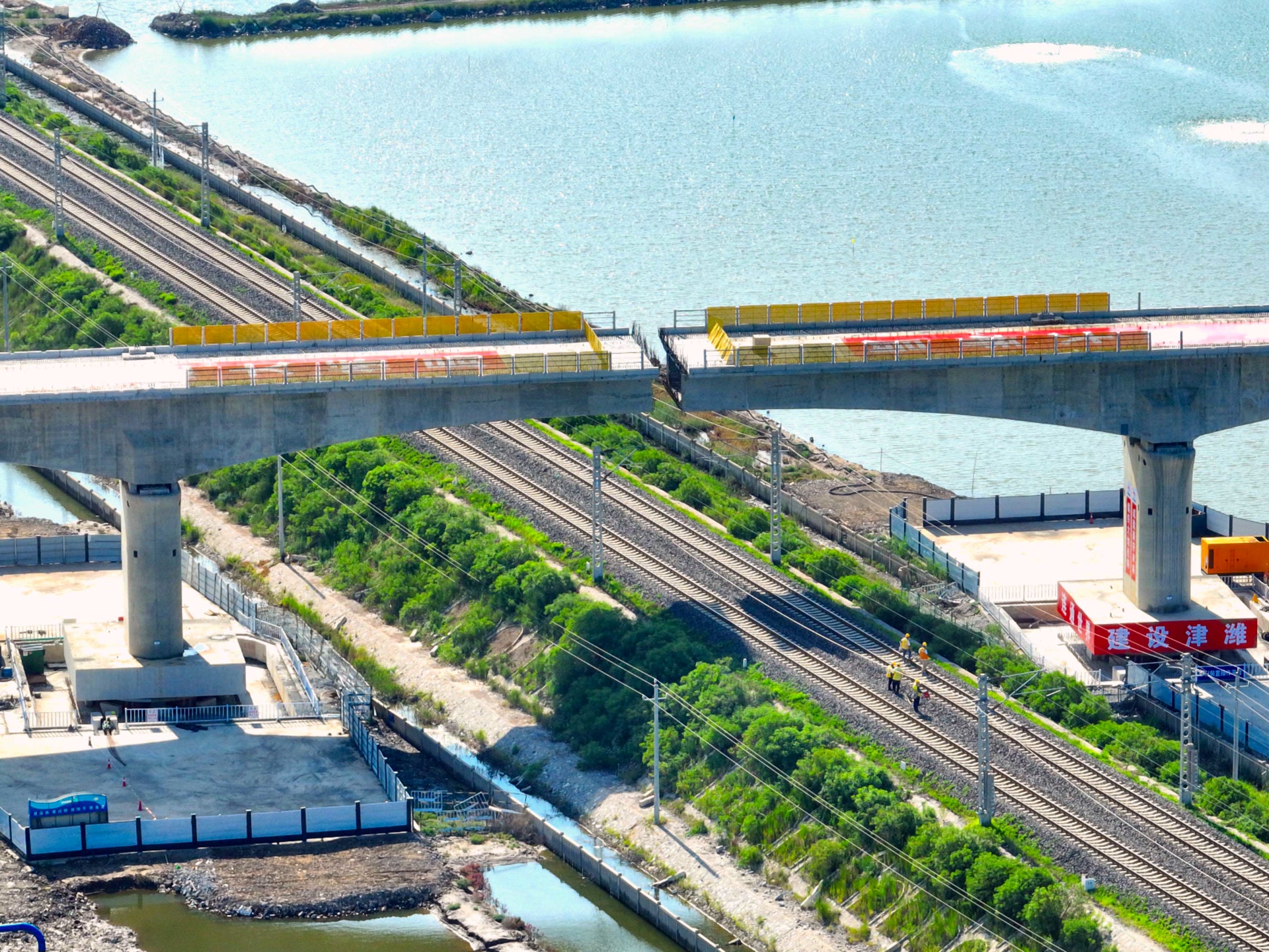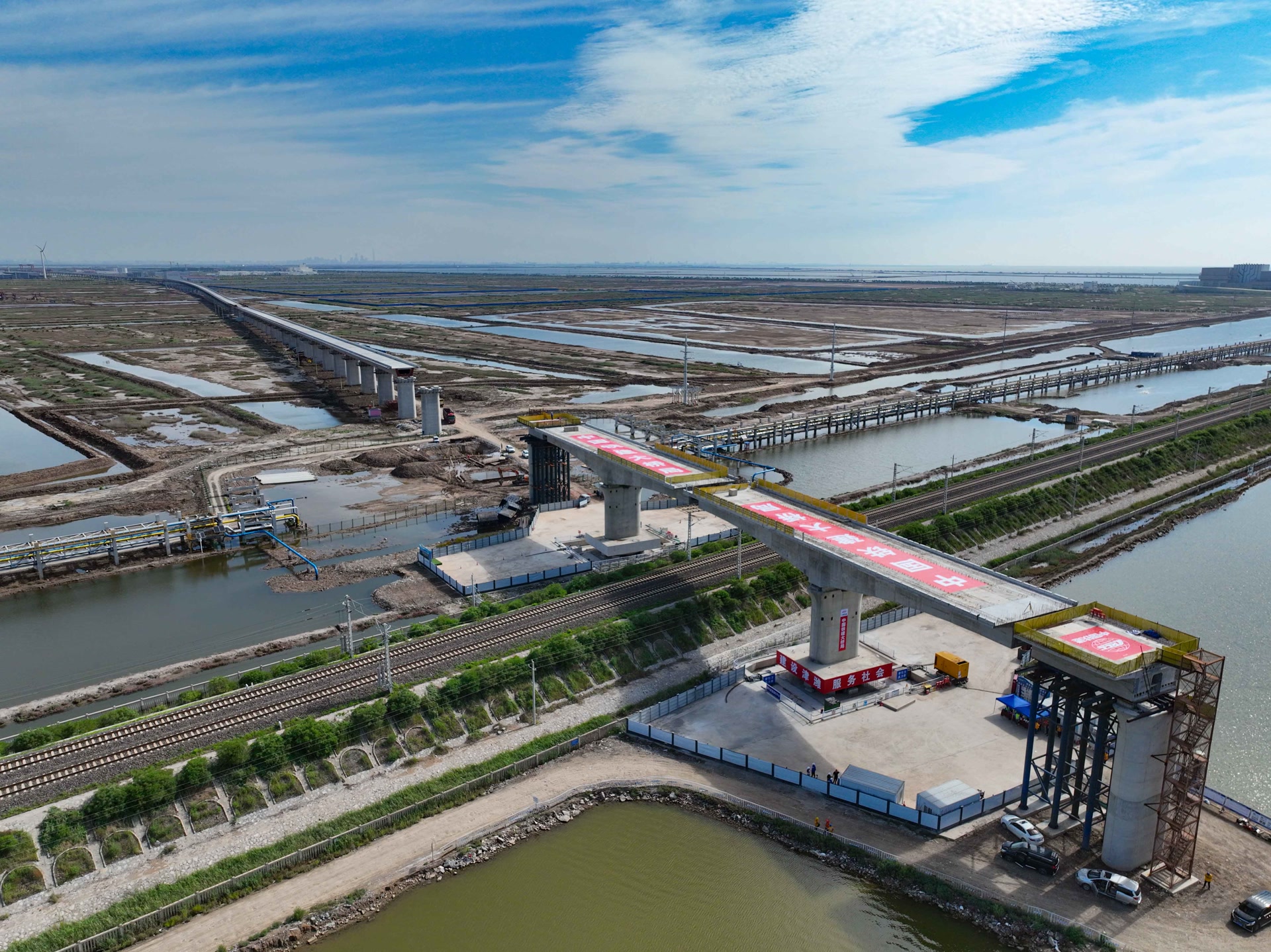 7月31日上午8时30分,滨海南特大桥跨南港铁路148米连续梁转体桥成功完成双墩同步转体,这是津潍高铁天津段唯一的转体桥工程,标志着滨海南特大桥A段梁体以下基本完成。