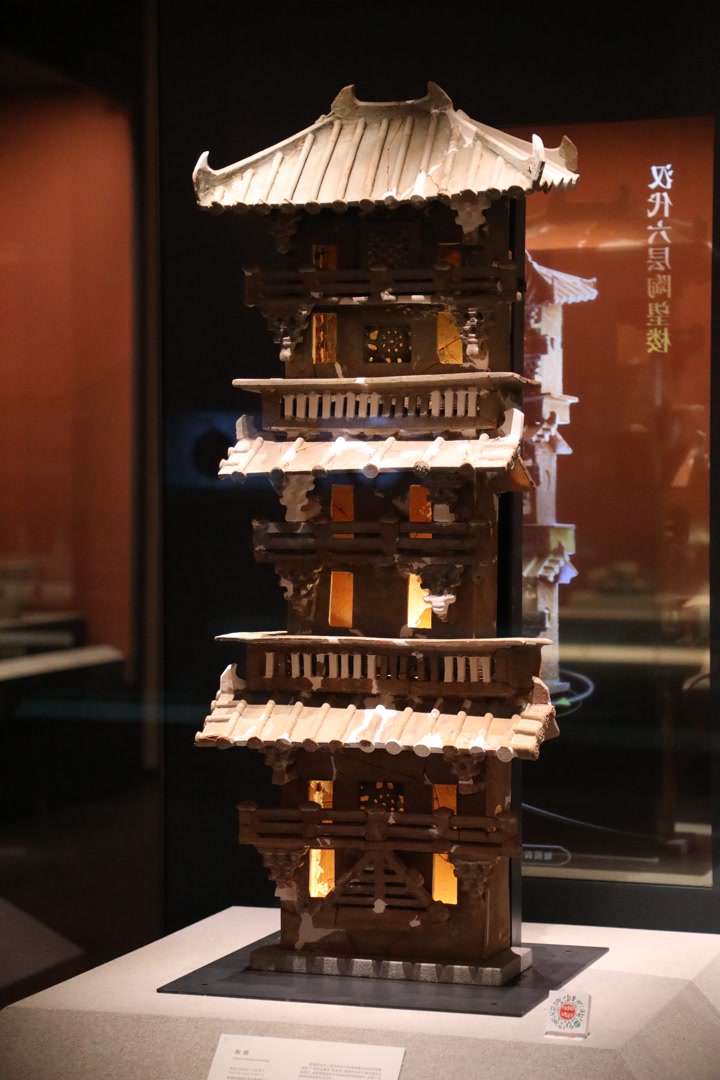 出土于路县故城遗址周边墓葬的东汉陶楼,为泥质灰陶质地,采用仿木结构建造,共6层。其斗拱、瓦脊等建筑构件雕塑逼真,是研究北京地区汉代建筑艺术和陶塑工艺的珍贵实物资料。作为汉代葬俗中的随葬明器,它属于陶楼品类之一,而陶楼涵盖仓楼、院落、楼阁、望楼等多种类型,其中用于庄园防卫、战争瞭望和侦察的被称为“陶望楼”,通常在最高层设置多窗口的瞭望空间,部分望楼还带有院落、前廊,门前可能放置瑞兽或护院动物。