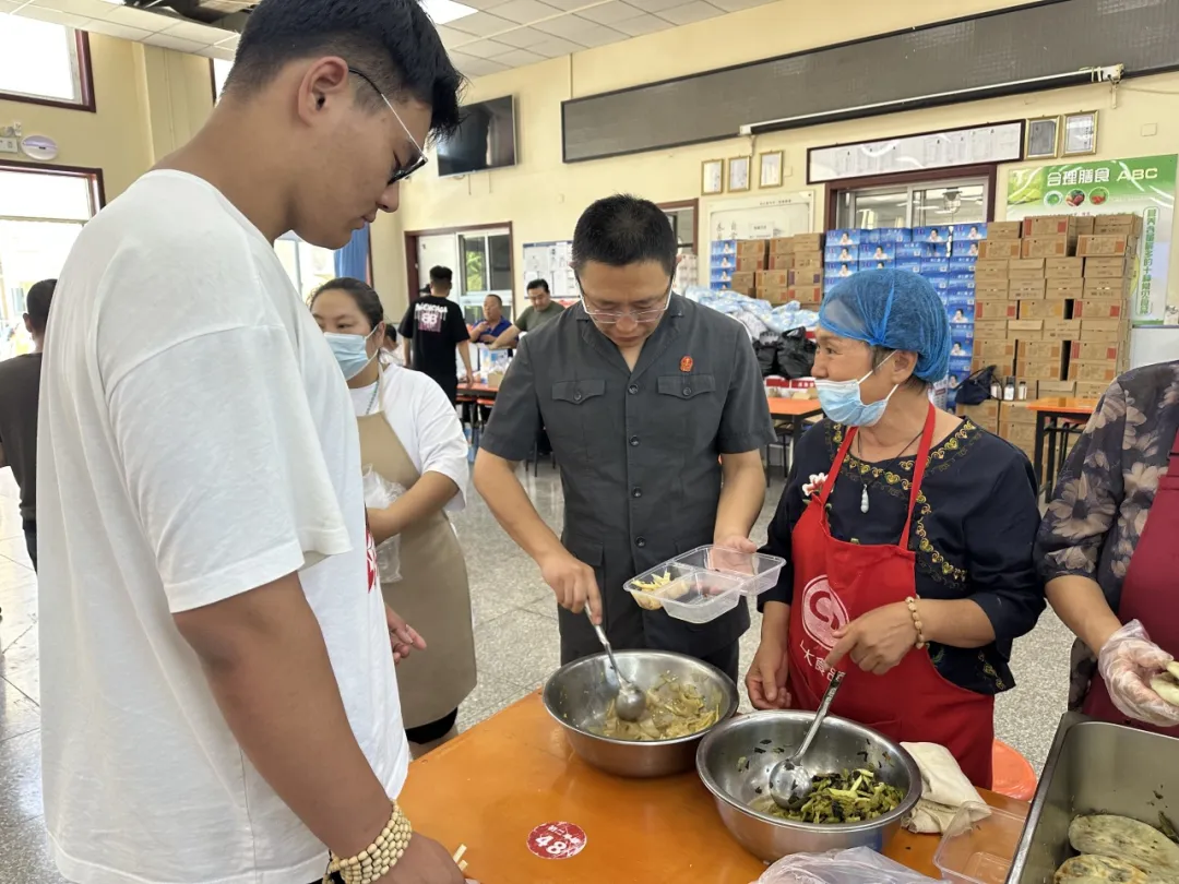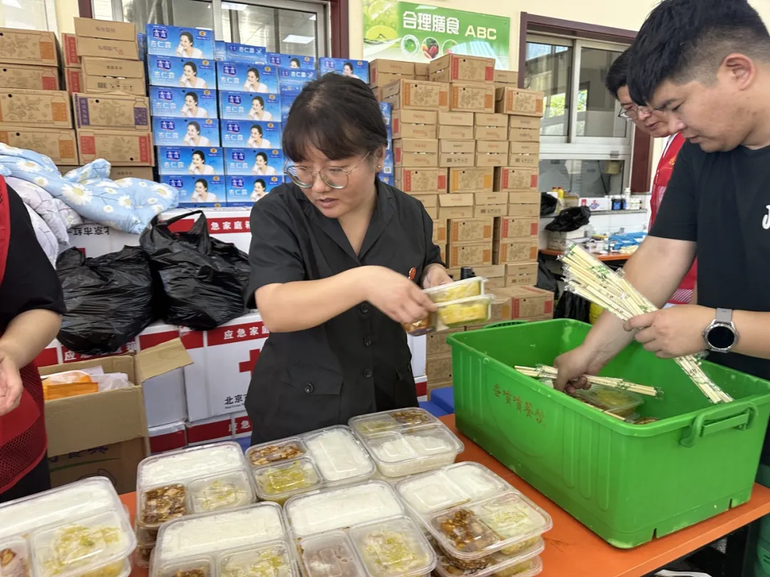 密云法院太师屯法庭庭长席引路带领全体干警,在保障审判工作正常运转的同时,利用休息时间,奔赴安置点支援,协助工作人员分发餐食,确保每位群众及时吃上热饭。