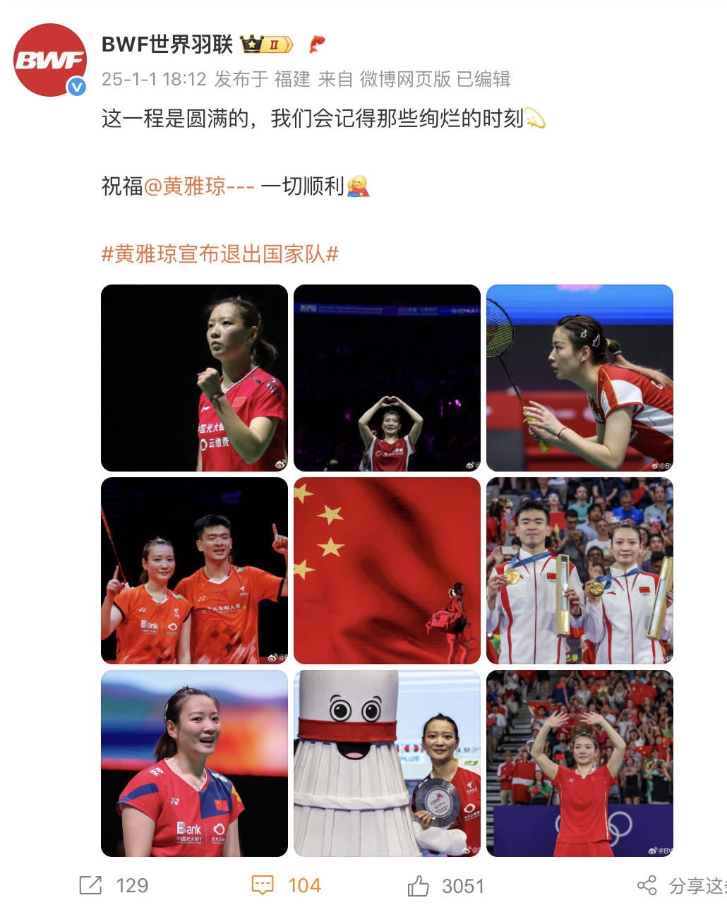 同日,世界羽联发文祝福黄雅琼:“这一程是圆满的,我们会记得那些绚烂的时刻。”她的搭档郑思维也为她送上祝福:“期待新征程,开启新生活。”