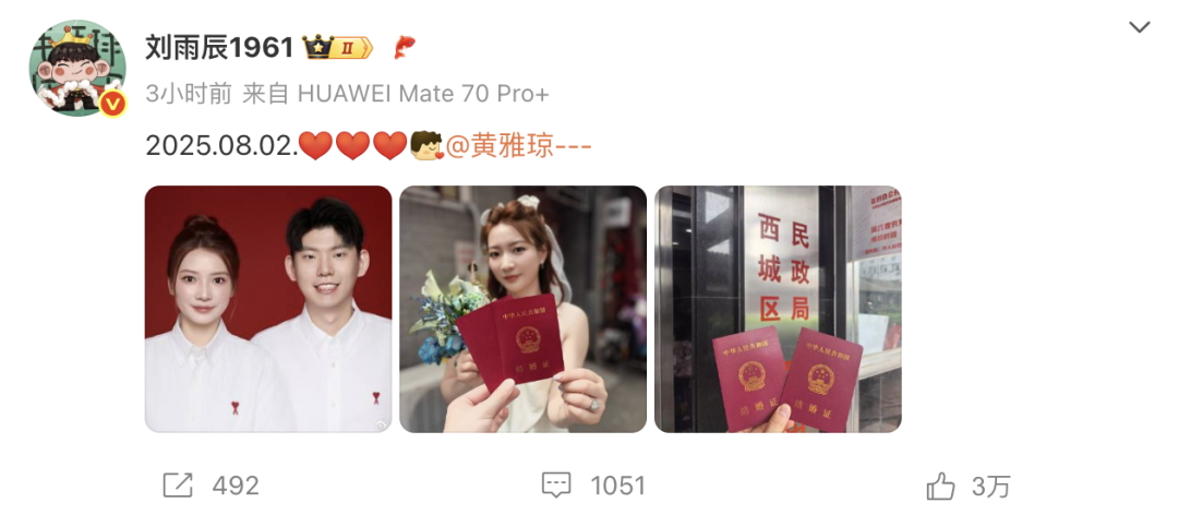今天,中国羽毛球运动员黄雅琼和刘雨辰在个人微博官宣领证,两人婚姻登记地点为北京市西城区民政局。