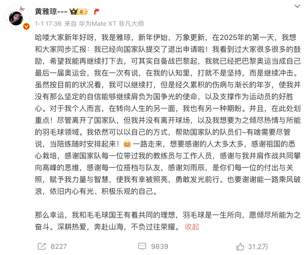今年1月1日,黄雅琼在微博上发文,宣布已向国家队提交退出申请:“虽然按目前的状况看,我可以继续打,但是经久累积的伤病与渐长的年岁,使我并没有那么坚定的自信能够继续肩负为国争光的使命,以及支撑作为运动员的好胜心。对于我个人而言,在转向人生的另一面,我也有另一种期盼。”