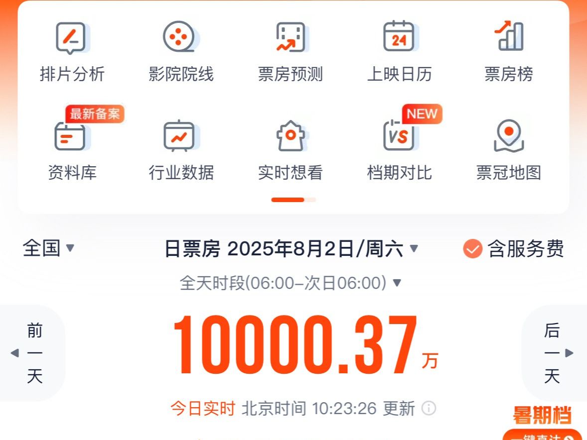不到四个半小时破亿!截至昨天10:23,2025年暑期档电影票房刷新单日破亿最快纪录。详情>>
