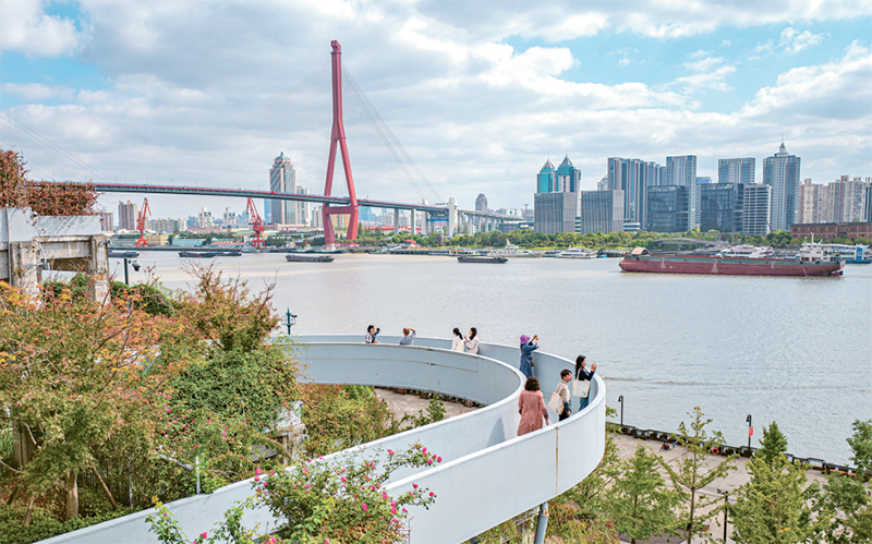 中央生态环境保护督察工作始终胸怀“国之大者”,服务经济社会高质量发展,推进生态环境高水平保护。通过督察整改,上海市杨浦滨江逐渐从以工厂仓库为主的生产岸线转型为以公园绿地为主的生活岸线、生态岸线、景观岸线,昔日的“工业锈带”变成如今的“生活秀带”。图为2024年10月24日,游客在杨浦滨江绿之丘参观。 人民图片 王初/摄