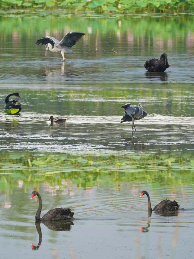 近期,海淀区一亩园公园扇面湖内,黑天鹅、苍鹭、野鸭、白骨顶鸡等众多水鸟云集,或在水中觅食,或在荷花丛中栖息,在三山五园间形成一幅优美的生态画卷。