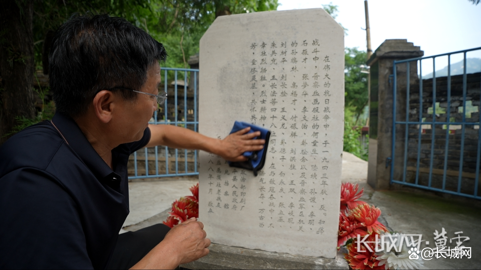 阜平县夏庄乡菜池村党支部书记兼村委会主任李文军在擦拭墓碑。长城网·冀云客户端记者 马宁 摄