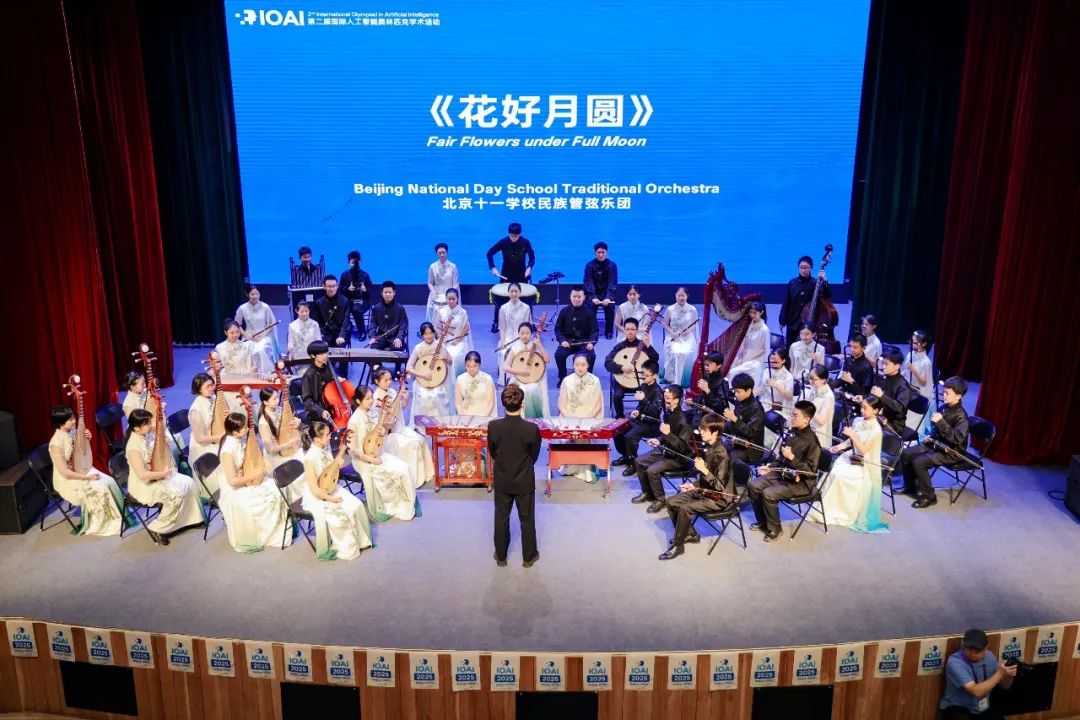 随着剧场灯光渐暗,十一学校民族管弦乐团的乐手们指尖轻扬,《花好月圆》的旋律如清泉般流淌而出。琵琶的清脆与二胡的悠扬交织,仿佛在诉说东方古国对科技与文化的双重礼赞。在这传统与现代交融的氛围中,本届IOAI的科技盛宴徐徐展开。