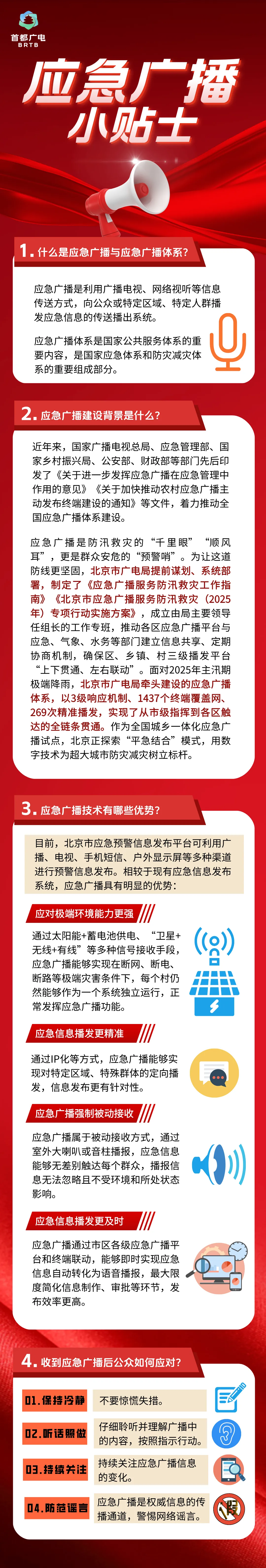 北京市广电局牵头建设的应急广播体系,凭借3级响应机制、1437个终端覆盖网和269次精准播发,实现了从市级指挥到各区触达的全链条贯通,为防汛工作筑牢了信息传递的坚实防线。在这场与暴雨的较量中,广电科技精准预警守护生命线,应急广播及时播报零中断,依托应急广播,一些群众得以平安转移,数字信号穿透雨幕织就安全屏障。