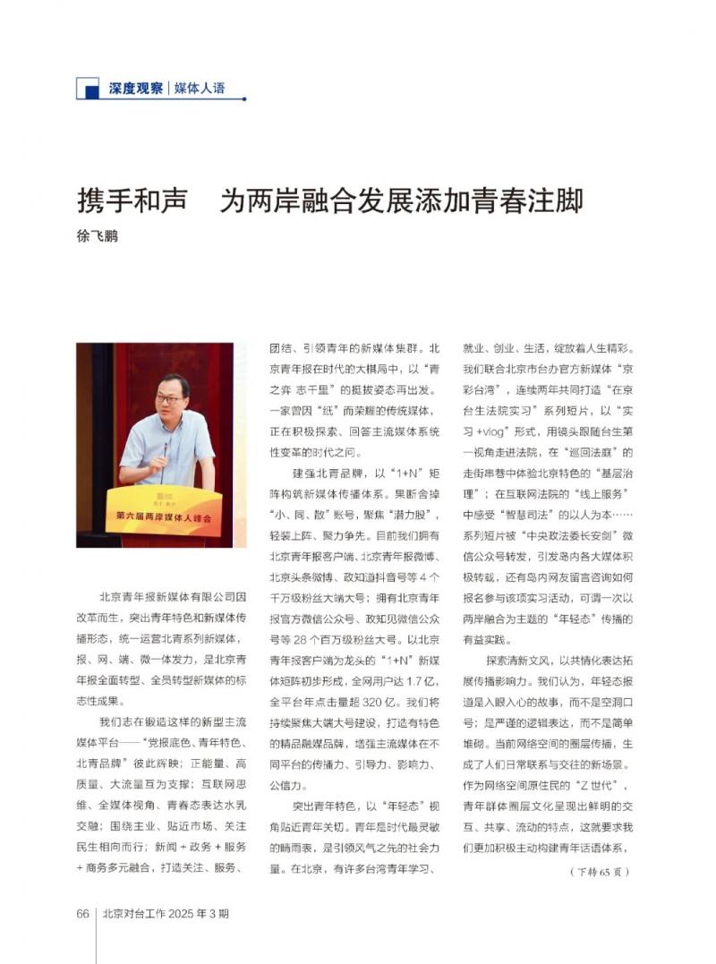 (作者系北京青年报新媒体有限公司董事长、总编辑,本文为作者在第六届两岸媒体人峰会之“青年媒体人对话——Z世代视角下的两岸叙事创新”分论坛上的发言)