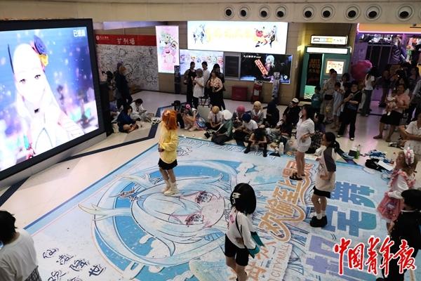 7月12日,改造成二次元商圈的郑州大上海城内,年轻人在跳随机舞蹈。焦晶娴/摄