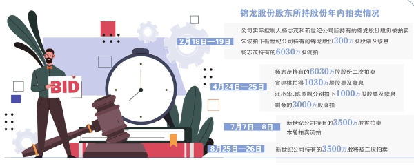 此前在2月,杨志茂和新世纪公司所持有的锦龙股份合计6230万股股份被拍卖,其中有自然人拍下新世纪公司持有的锦龙股份200万股股票及孽息,杨志茂持有的6030万股则流拍。4月,杨志茂持有的6030万股二次拍卖,3名自然人竞拍下锦龙股份合计3030万股及孽息,剩余的3000万股则流拍。