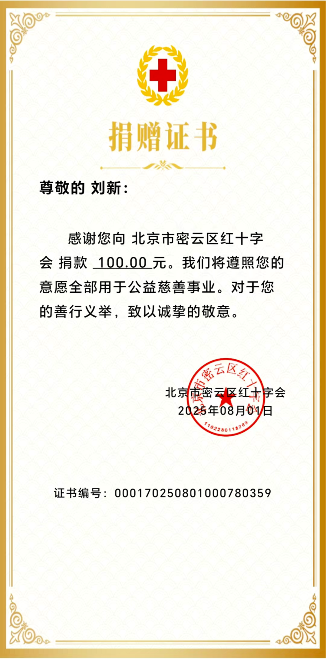 刘新是一名90后,3岁时因为一场意外车祸造成下肢瘫痪,不能自理,主要依靠轮椅出行。现在,刘新作为淘宝的一名店主,和家人一起网上销售密云农产品,他与父母、妻子和三个孩子的共同生活并不富裕,但乐观向上的性格使他一直追光而行,同时不断发光散热。这次密云区受灾后,刘新尽己所能通过区红十字会捐款,还为村委会的防汛人员捐赠了矿泉水。用他的话说:作为密云人,家乡有难,自己必须出力,他相信“爱出者爱返,福往者福来”,在大家的共同努力下,大美密云,依旧风光秀丽。截至目前,区残联已将刘新捐赠的物品送到了石城镇,供安置点有需求的残疾人或老人使用。