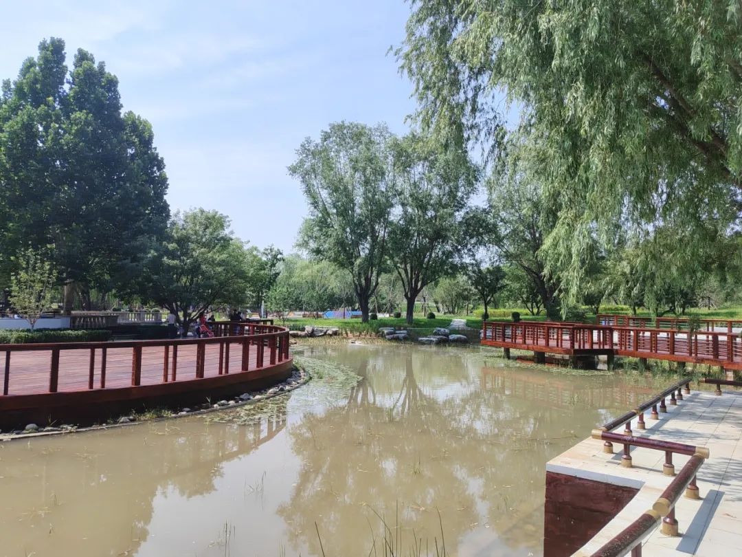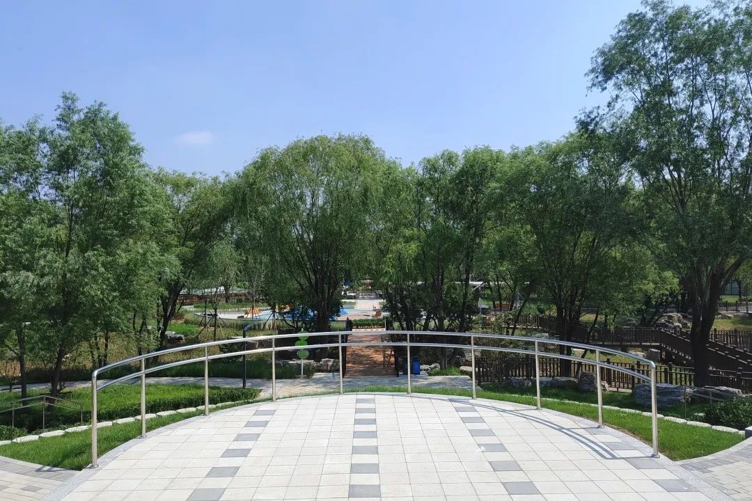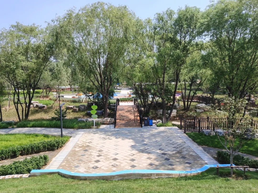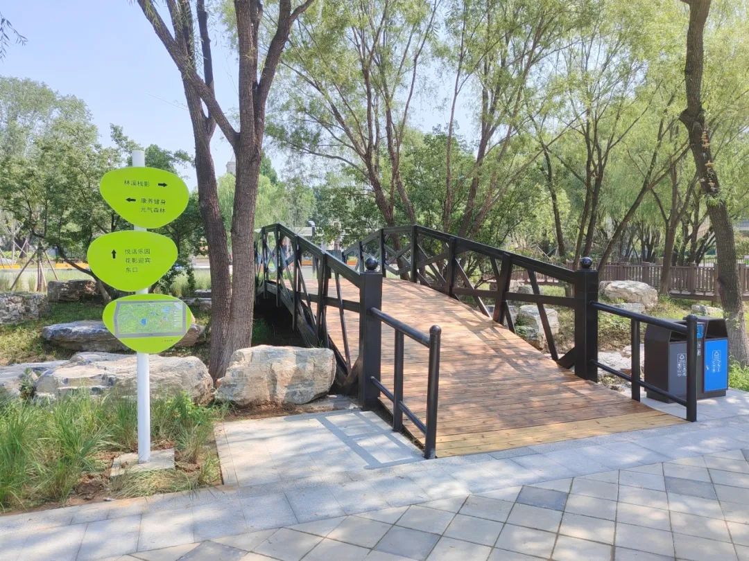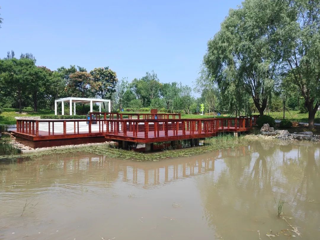 改造过程中,首先对现状植被进行系统评估,完整保留国槐、白蜡等长势旺盛、遮阴效果佳的乔木作为生态骨架,科学增植彩叶树种、观花灌木、观赏草及多样化地被植物,构建丰富的垂直植被结构与四季景观序列——春季有玉兰、山桃、樱花绽放,夏季有紫薇、月季盛开,秋季有元宝枫、银红槭、秋紫白蜡呈现斑斓色彩,湿地区域点缀鸢尾、睡莲等水生植物。通过微地形处理强化中下层植被,形成生态复层结构,非通行区域采用密集种植引导人流走向。