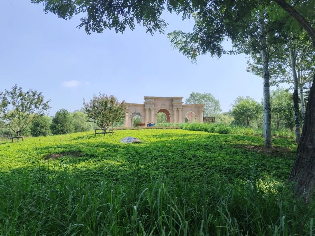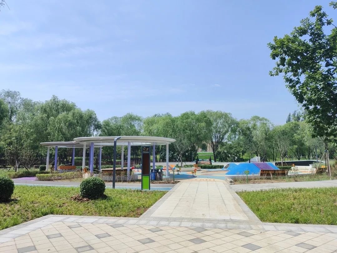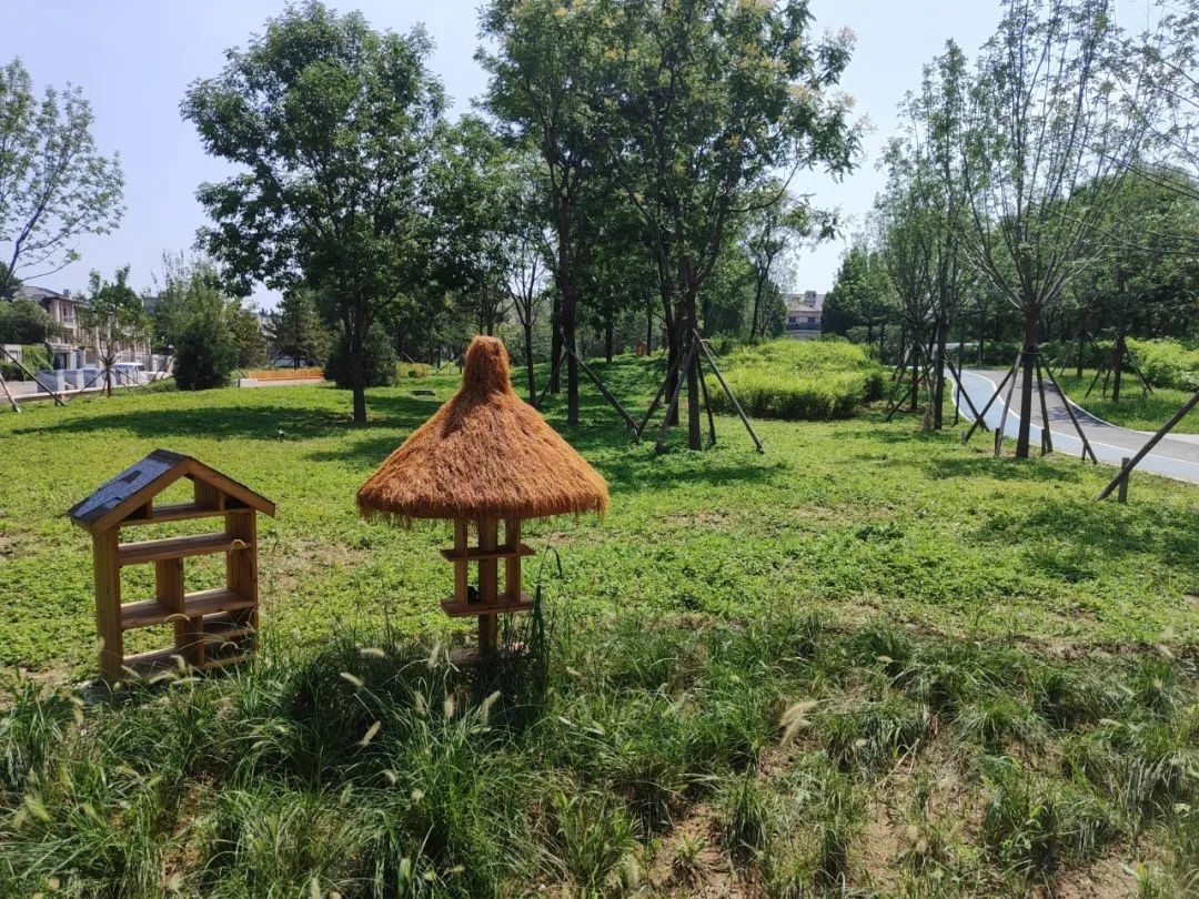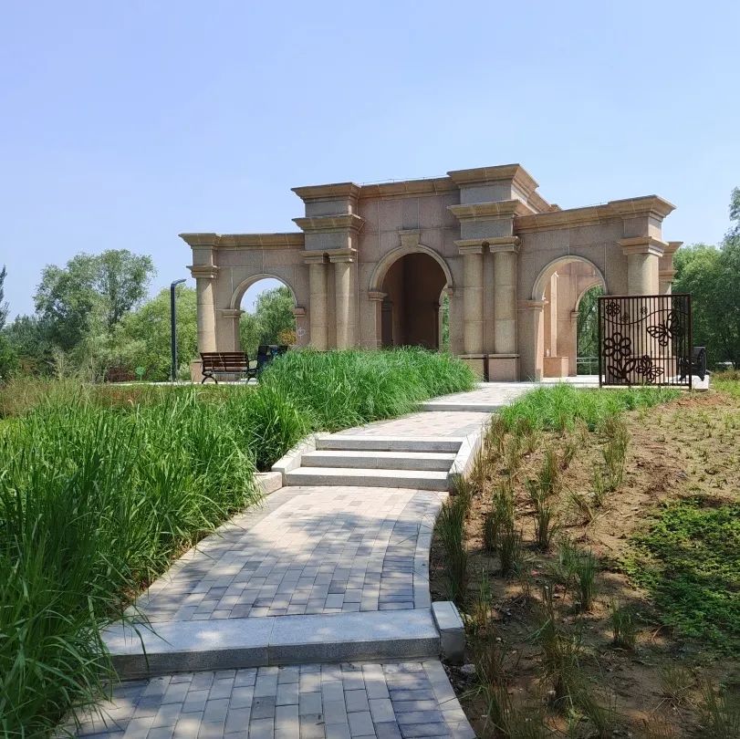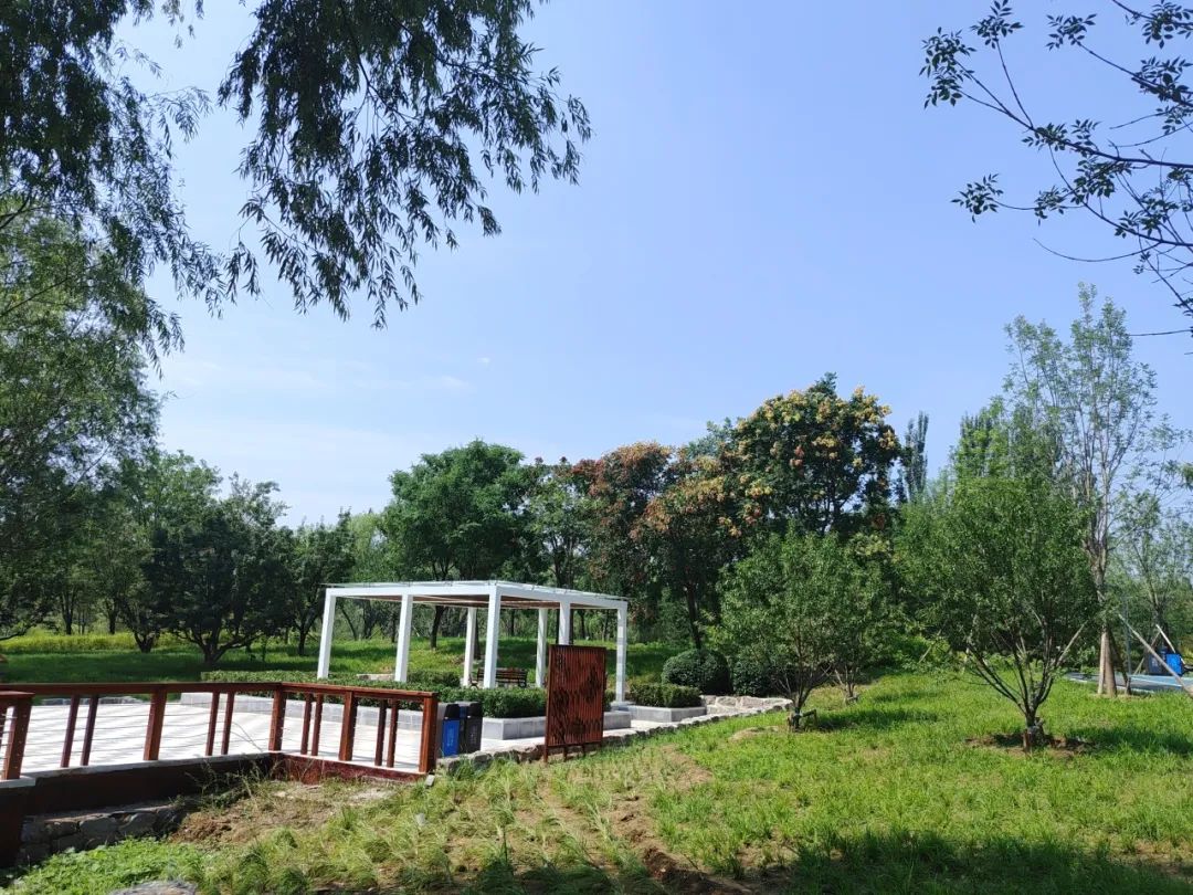 改造过程中,首先对现状植被进行系统评估,完整保留国槐、白蜡等长势旺盛、遮阴效果佳的乔木作为生态骨架,科学增植彩叶树种、观花灌木、观赏草及多样化地被植物,构建丰富的垂直植被结构与四季景观序列——春季有玉兰、山桃、樱花绽放,夏季有紫薇、月季盛开,秋季有元宝枫、银红槭、秋紫白蜡呈现斑斓色彩,湿地区域点缀鸢尾、睡莲等水生植物。通过微地形处理强化中下层植被,形成生态复层结构,非通行区域采用密集种植引导人流走向。