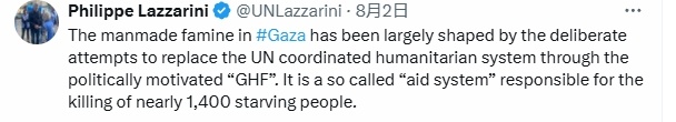 联合国近东巴勒斯坦难民救济和工程处(近东救济工程处)主任专员拉扎里尼日前在社交媒体上发文指出,加沙出现的人为饥荒,很大程度上是因为美以支持的“加沙人道主义基金会”蓄意取代了联合国主导的人道主义协调工作。