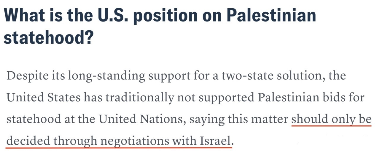作为以色列最主要的支持者,美国政府虽然一直口头支持“两国方案”,但在巴勒斯坦建国问题上却完全附和以色列的立场,即这一问题必须通过以巴直接谈判来解决。