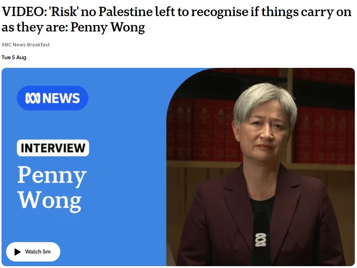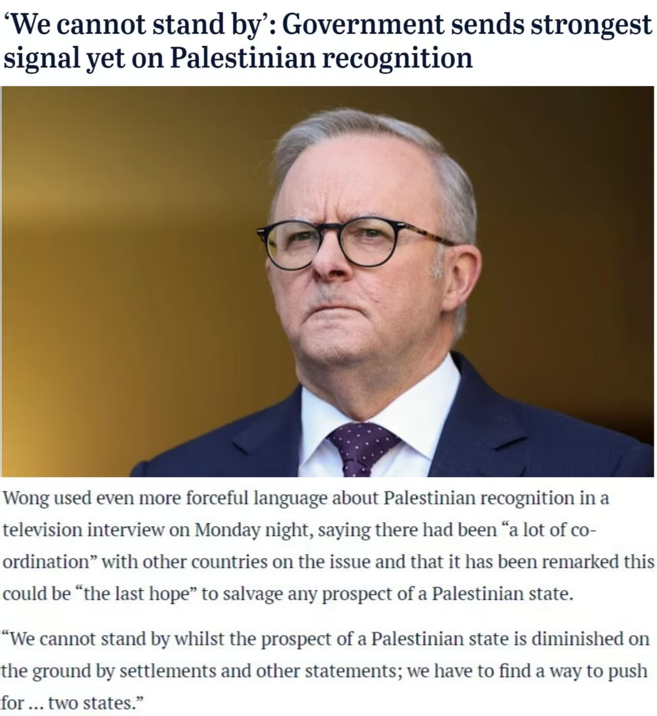 受它们的影响,澳大利亚政府也正考虑在9月联大期间加入“承认”行列。用澳外长黄英贤的话说,当以色列通过各种方式削弱巴勒斯坦建国前景时,“我们不能袖手旁观,必须找到一种方法来推动落实‘两国方案’”。