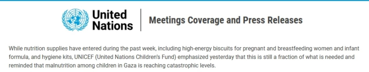联合国人道主义协调厅日前表示,当前进入加沙的人道主义救援物资仍远低于实际需求。联合国儿童基金会称,尽管近几天有少量营养食品、婴儿配方奶和卫生用品得以进入,但数量仍远远不足,加沙儿童的营养不良状况已达到灾难级别。