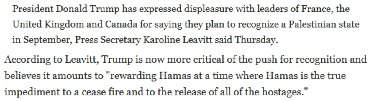 白宫新闻秘书莱维特称,美国总统特朗普与法英加等国领导人在巴勒斯坦地位问题上持不同意见,特朗普现在对推动承认巴勒斯坦国持更加批评的态度,并认为这种做法相当于“奖励哈马斯”。