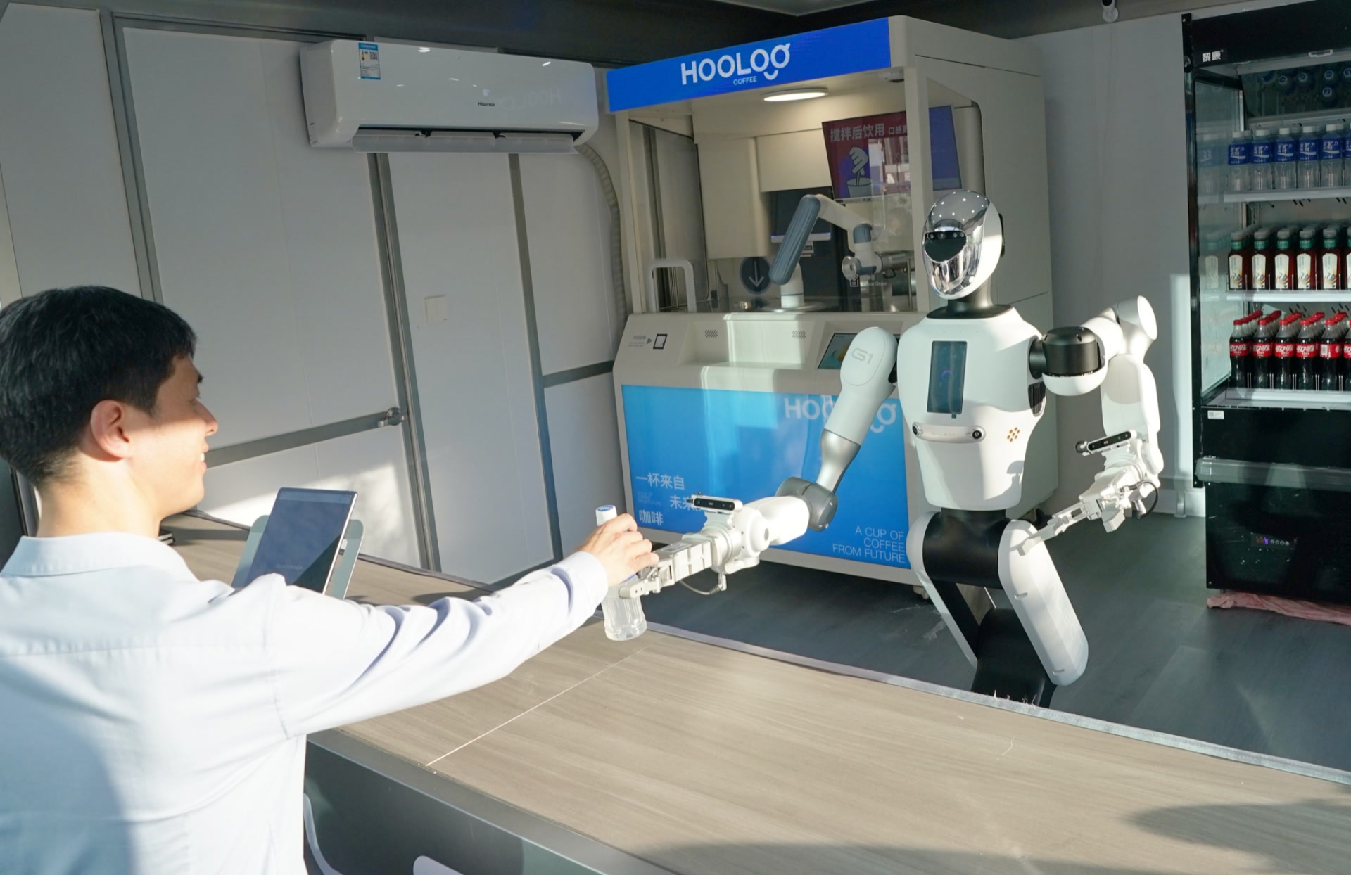 记者现场看到,刚刚亮相的银河太空舱前已经排起长队,人们纷纷体验机器人“店小二”的服务。一位顾客在点单台的屏幕上扫码、下单、支付,想要购买一瓶乌龙茶。“好的,这就帮您拿!”Galbot机器人转身来到货架前,抬高身体,伸出手臂,顺利从货架上选中并夹住顾客所点的饮料,转身来到柜台前,将饮料递给顾客。“这是您的商品。”不到一分钟,一单交易完成了。整个过程中,无工作人员进行遥控操作,全部为机器人自主完成。