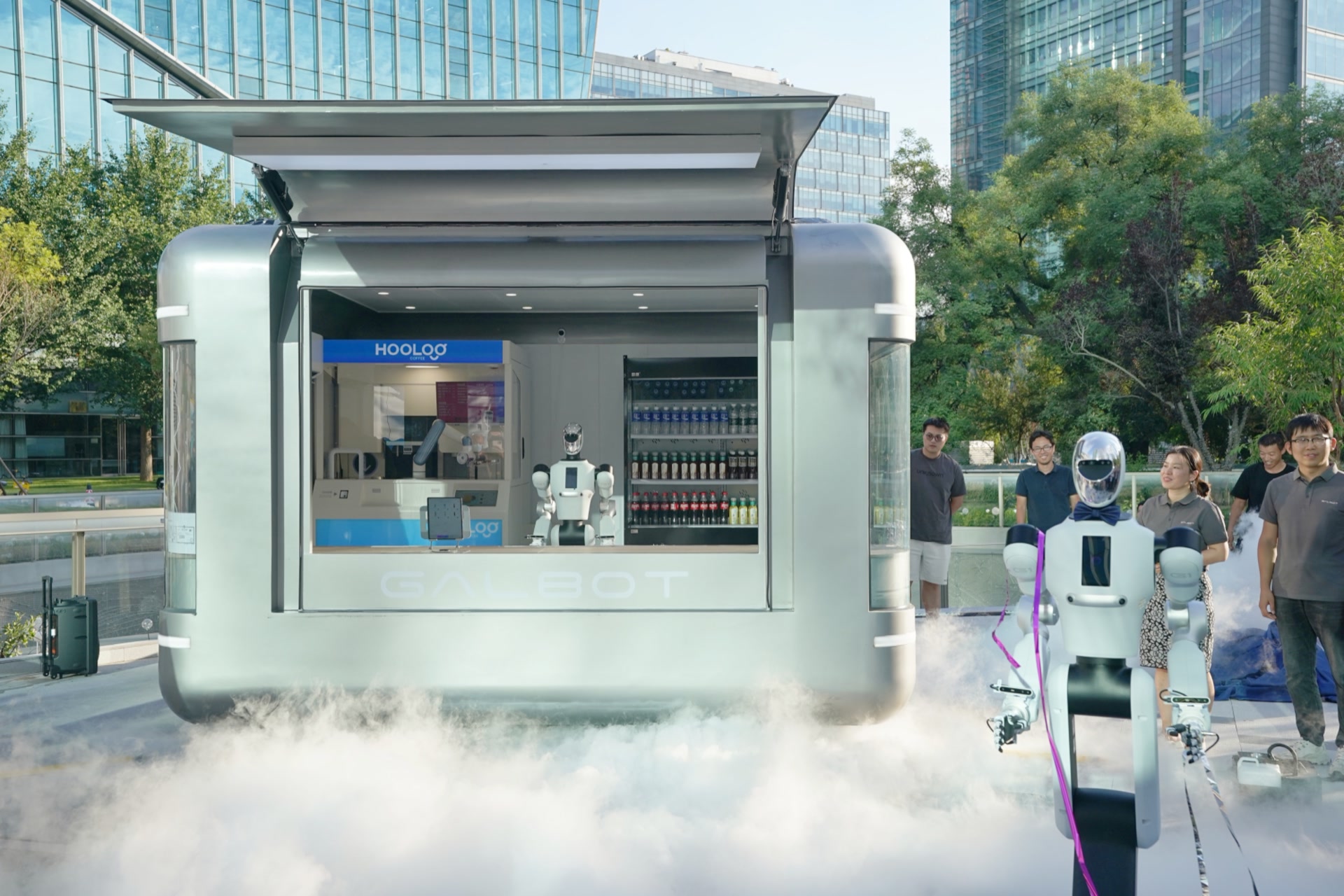 在中关村大融城的户外广场上,十多平方米大小、银灰色外壳、太空舱形态的零售舱刚刚落地,前舱盖自动升起,形成了一个充满科技感的“雨搭”。舱内,一台自动咖啡机和一部摆满饮品的货架前,和人类成人差不多高的机器人Galbot正在忙碌着。