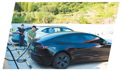 公平竞争机制下,更多企业进入江西石城县充电桩运营市场。图为市民在市场化运营的充电站为新能源汽车充电。温京燕摄