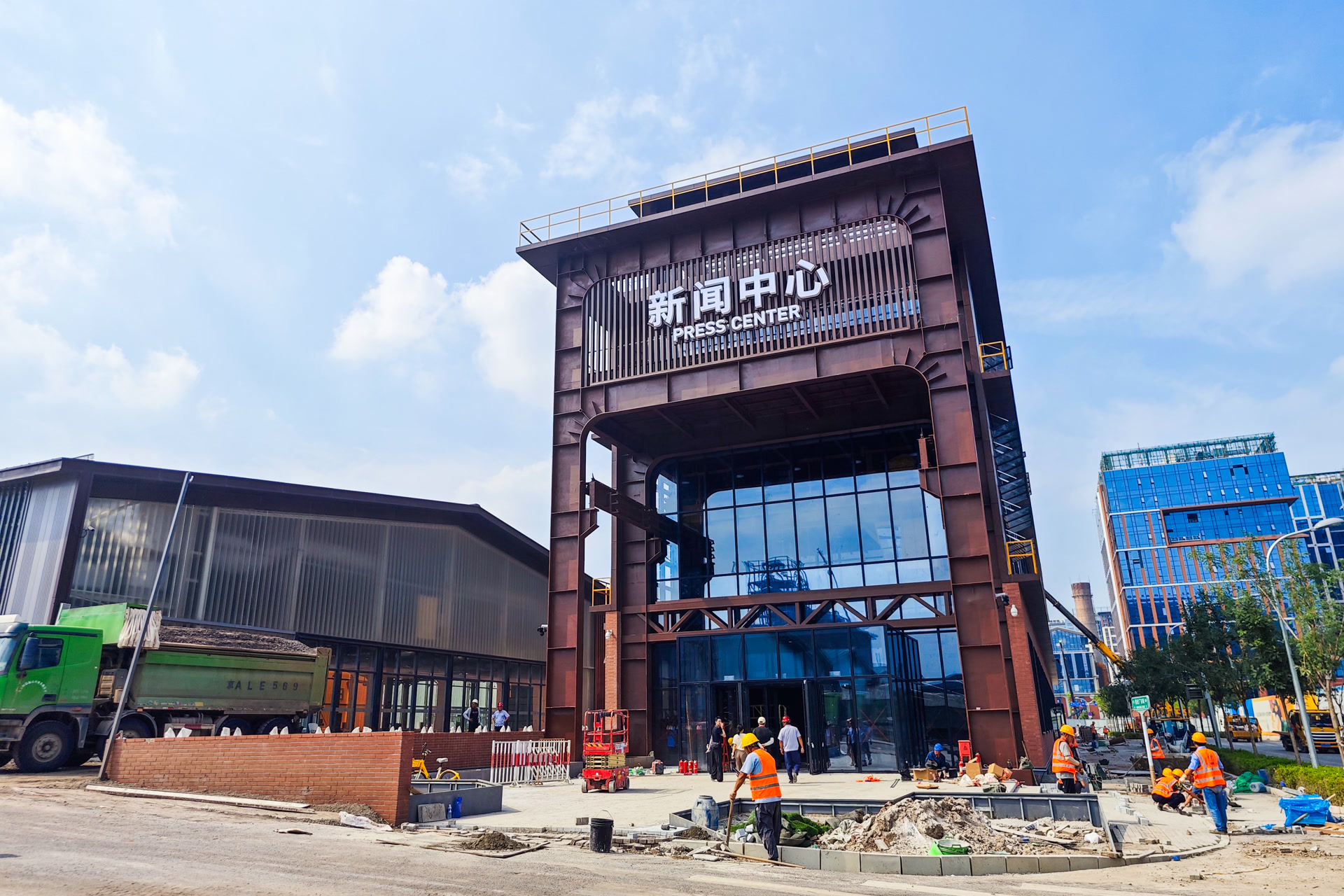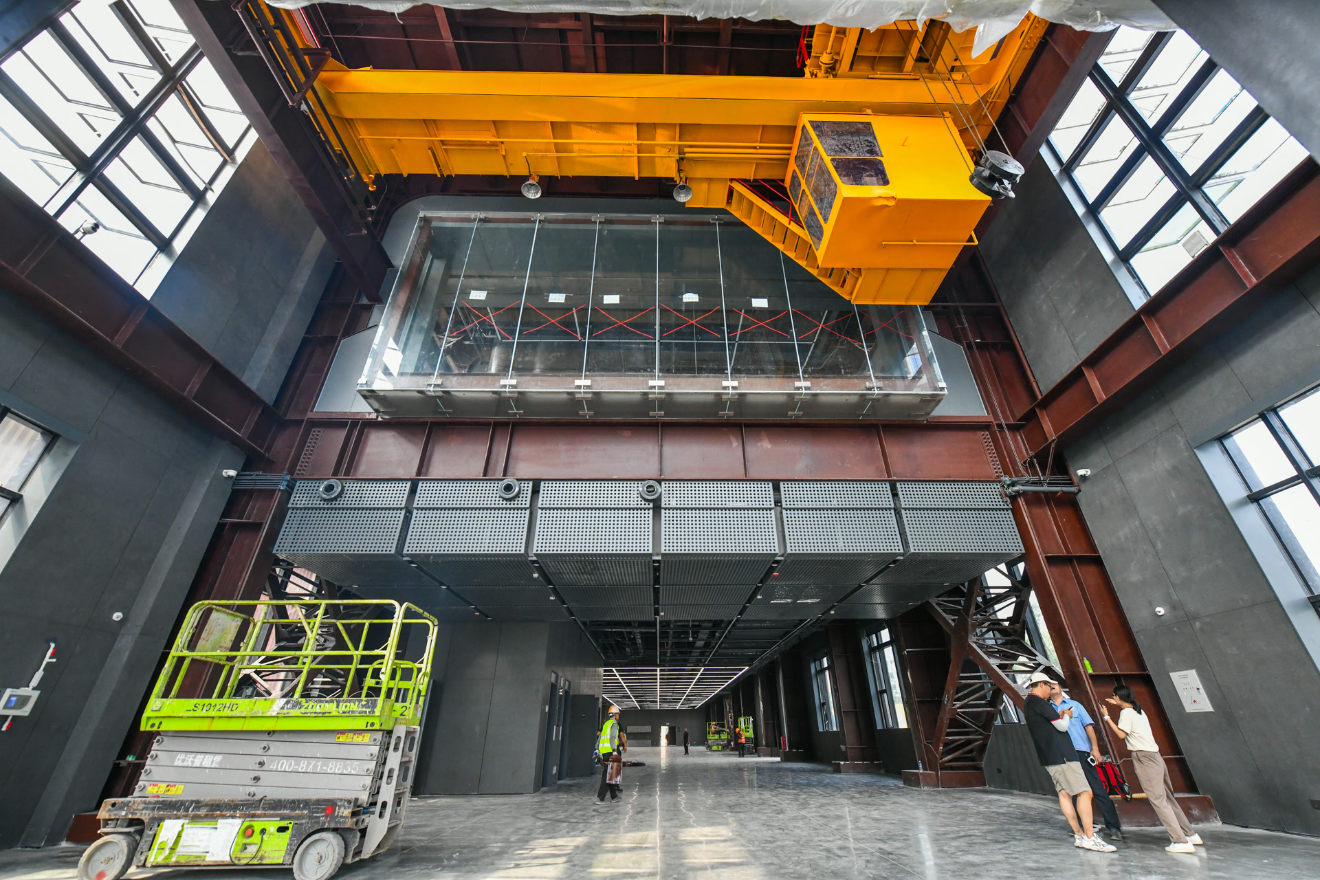 从今年服贸会起,一座全新的新闻中心即将投用,迎来全球记者的光顾。在7号馆东侧,曾用作冷却烧结矿的二烧结风机房内,工人们忙碌着最后的精装修作业,抬眼望去,工业生产时期的钢铁框架、室内天车都予以保留。原厂房为单层通高空间,需新增三层楼板以满足新闻中心功能使用需求,这成为老厂房改造的最大难点。