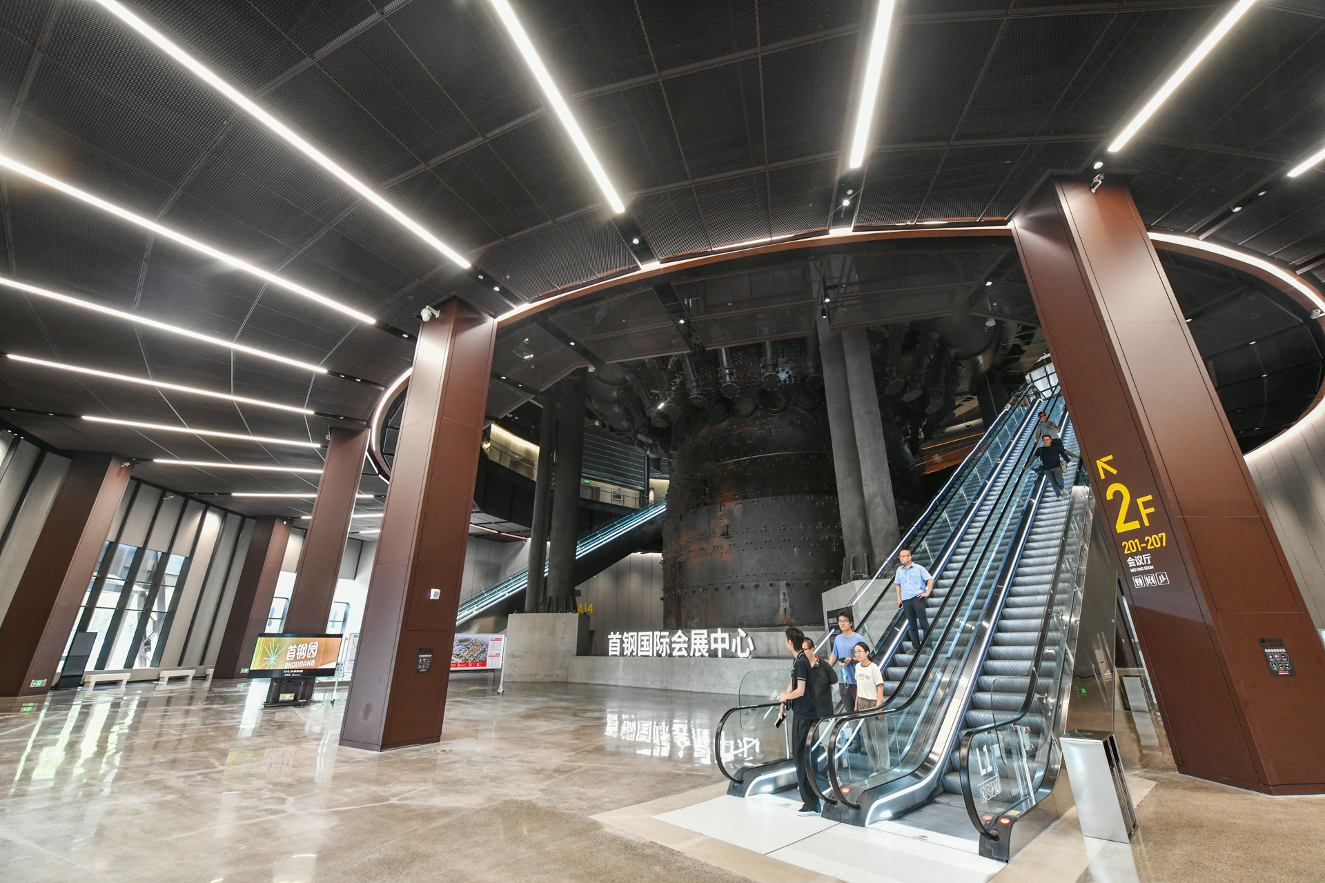 2024年服贸会上,四高炉以首钢国际会展中心的身份全新亮相。今年,这座独具工业风特色的会展综合体迎来新使命,二层展示空间将升级改造为峰会会场。四高炉顶部全新安装的服贸会LOGO将在夜幕中点亮,门前广场的旗杆林已安装就位。走进大门,沿着12米高的扶梯上行,观众能欣赏炉芯的造型和质感,移步换景中直达二层空间。