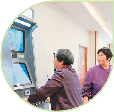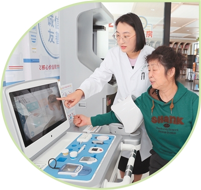 在山东省东营市东营区一家智慧健康驿站,老人在医护人员指导下使用5G智能健康一体机体检。刘智峰 摄(人民视觉)
