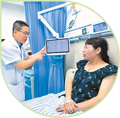 江西省宜春市人民医院的医生在智慧病房利用患者床头交互系统查房,并与患者交流治疗方案。周亮 摄(人民视觉)