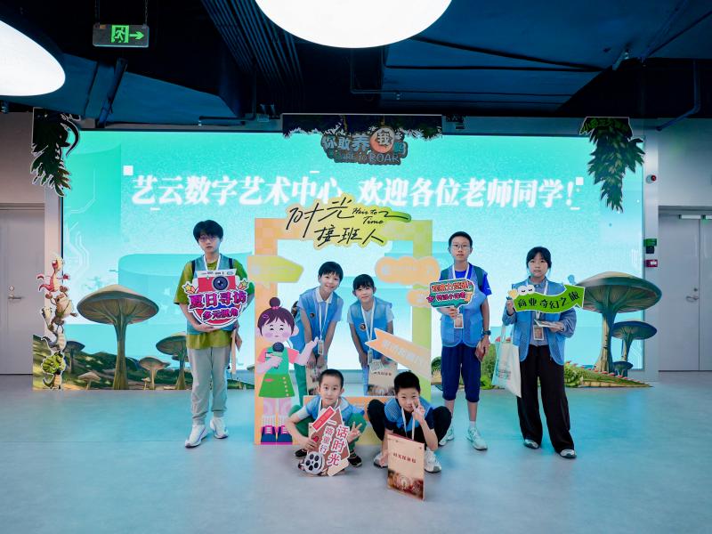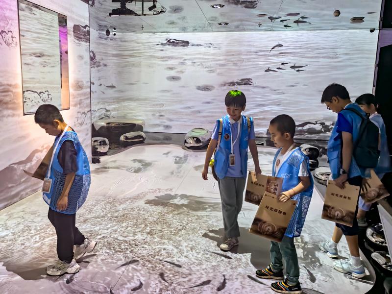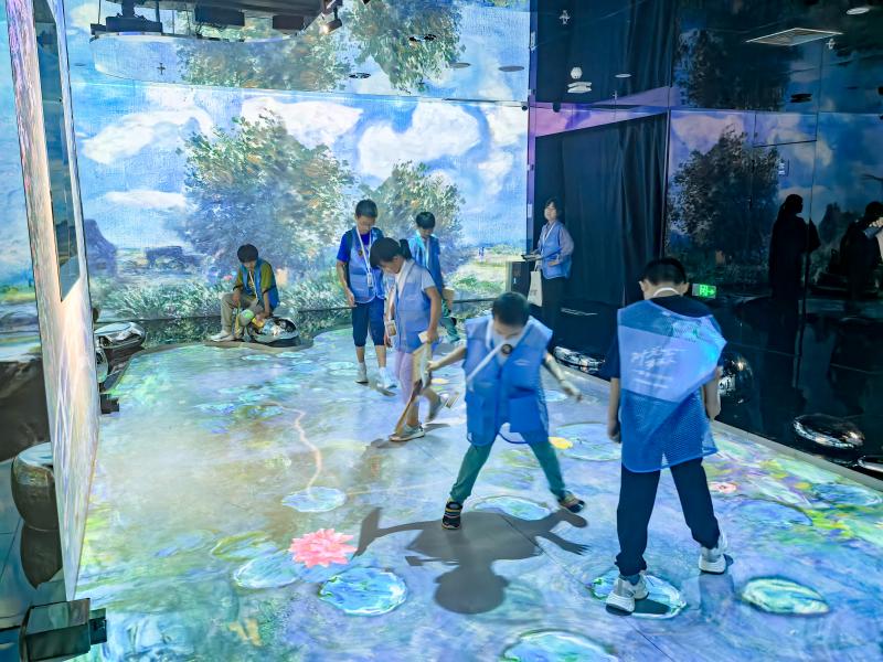 “我们掉进了莫奈的《睡莲》里,个个脚踩睡莲在河中行走。突然,画风一变,绚丽的色彩被浓重的黑白色覆盖,我们进入了中国的水墨画。在画中,我们走过的每个地方都有一群鱼儿在嬉戏,坐在莲花上那一刻,仿佛闯入了东方的水墨世界。”在小记者笔下,数字技术让西方印象派与东方水墨在此相遇,让艺术从静态画布变为可触碰的灵动场景,在此落入艺术的世界,收获了奇妙体验。艺云数字艺术中心让孩子们在互动中真切触摸到文化与科技碰撞的火花。