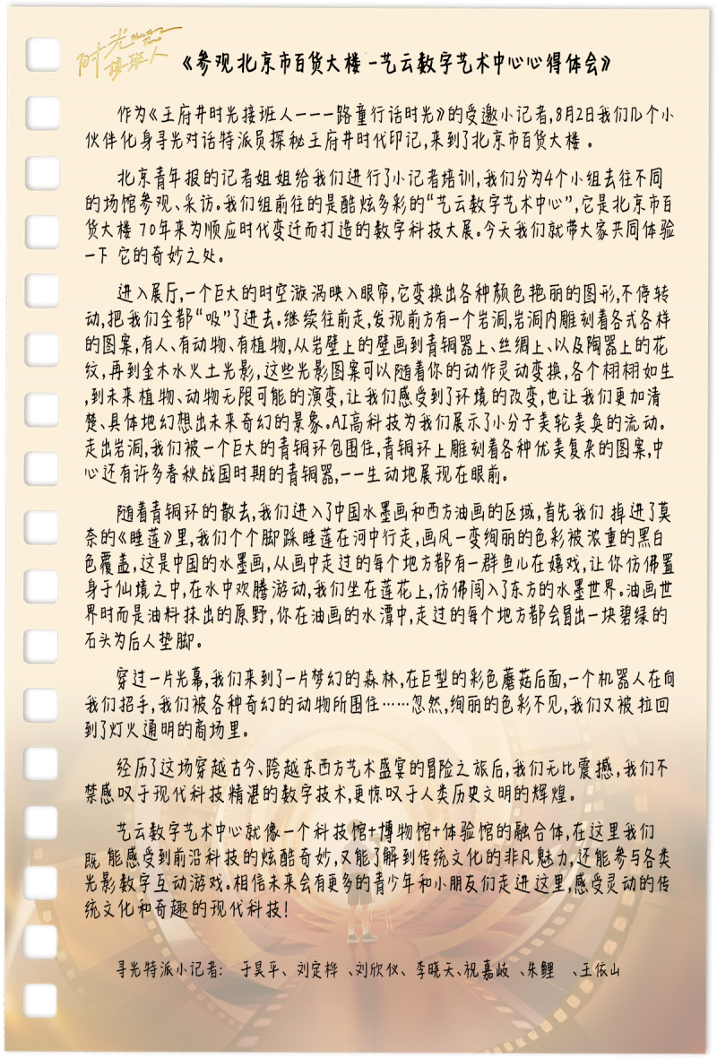 从“一团火”精神的延续到数字艺术与传统商业的融合,北京市百货大楼以“文化赋能场景、消费升级体验、业态创新融合”的发展理念,开创了传统商业空间转型发展的新范式。这里既是承载首都商业记忆的历史地标,更成为小记者们触摸时光温度的实践场:孩子们在老柜台的斑驳痕迹里读懂坚守,在数字展区的光影流转中看见创新,切身感受着商业文化的时光变迁。这种将历史底蕴转化为可感知的当代价值的探索,让“时光接班人”在沉浸式体验中理解商业在传承与创新中的生动写照,也彰显了新时代首都商业的文化自信与发展底气。